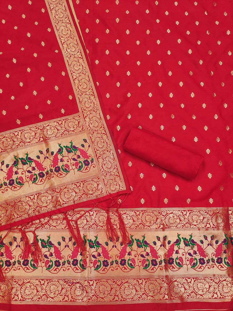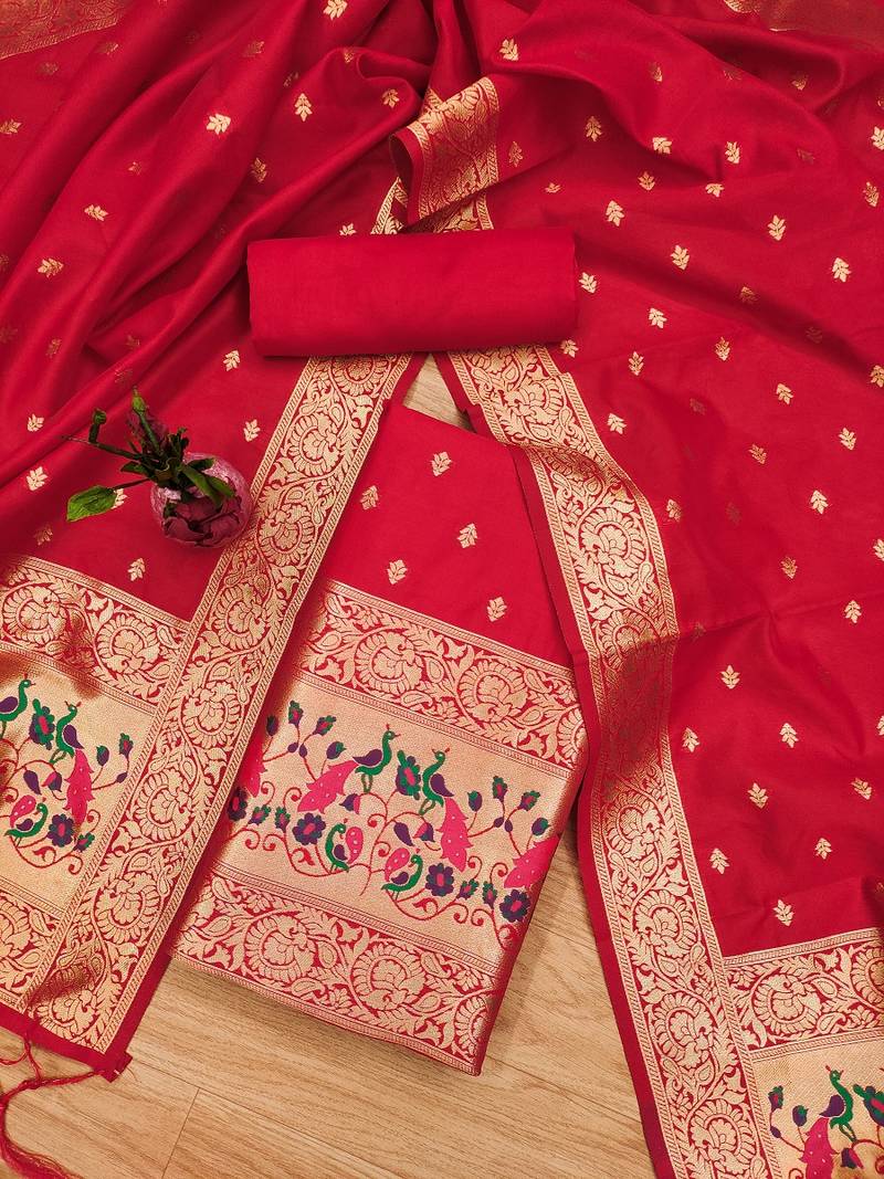 Red soft banarasi silk pure zari woven design dress material unstitched