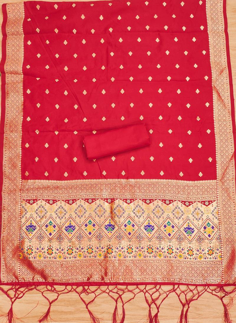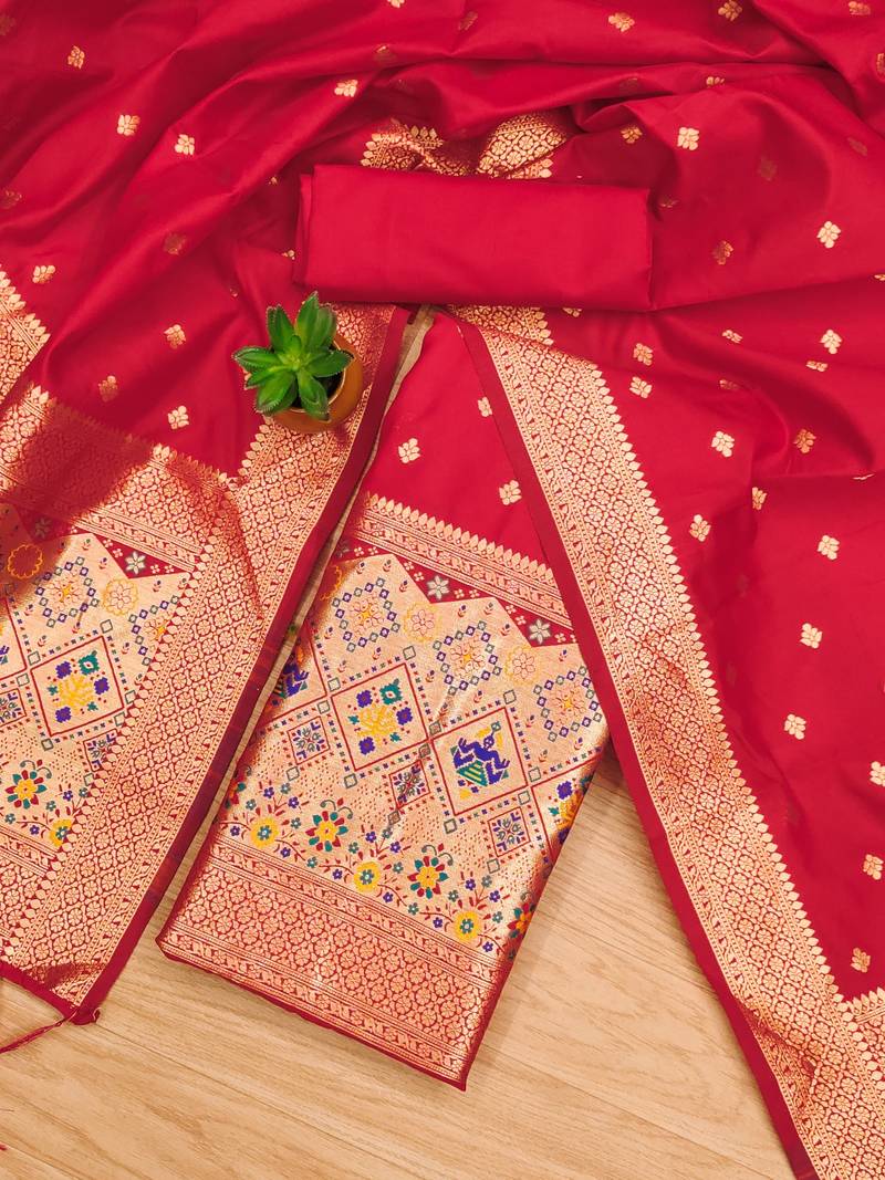 Red soft banarasi silk pure zari woven design dress material unstitched