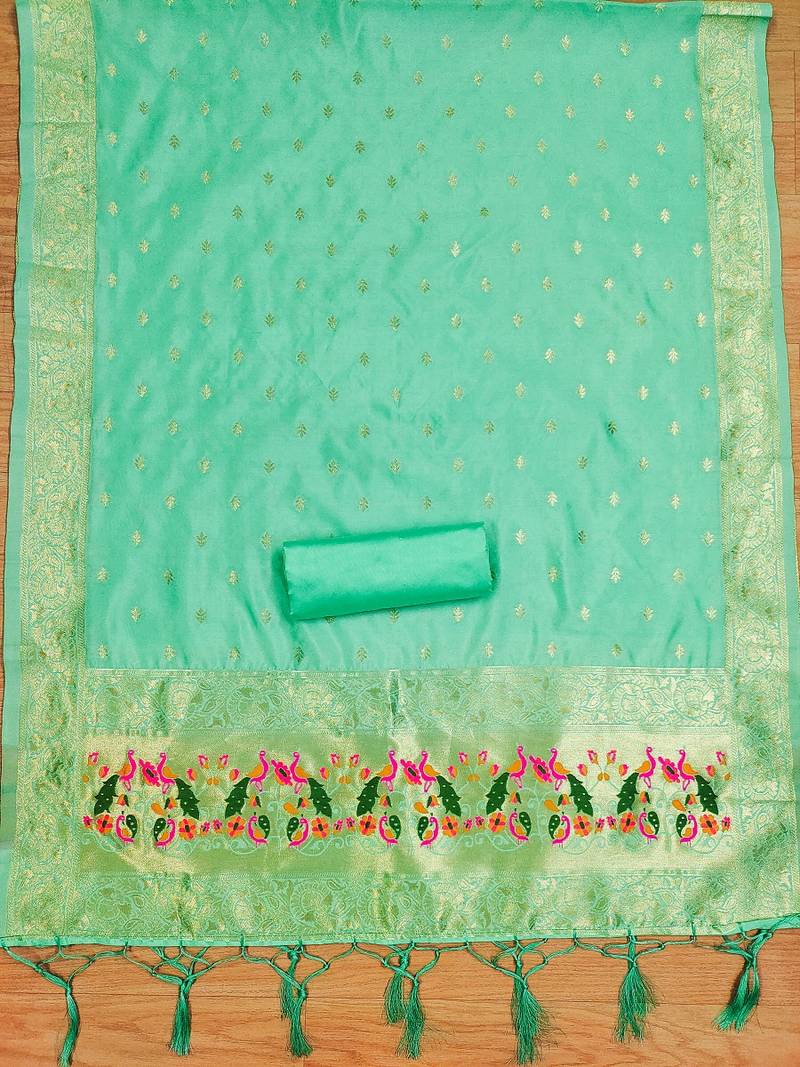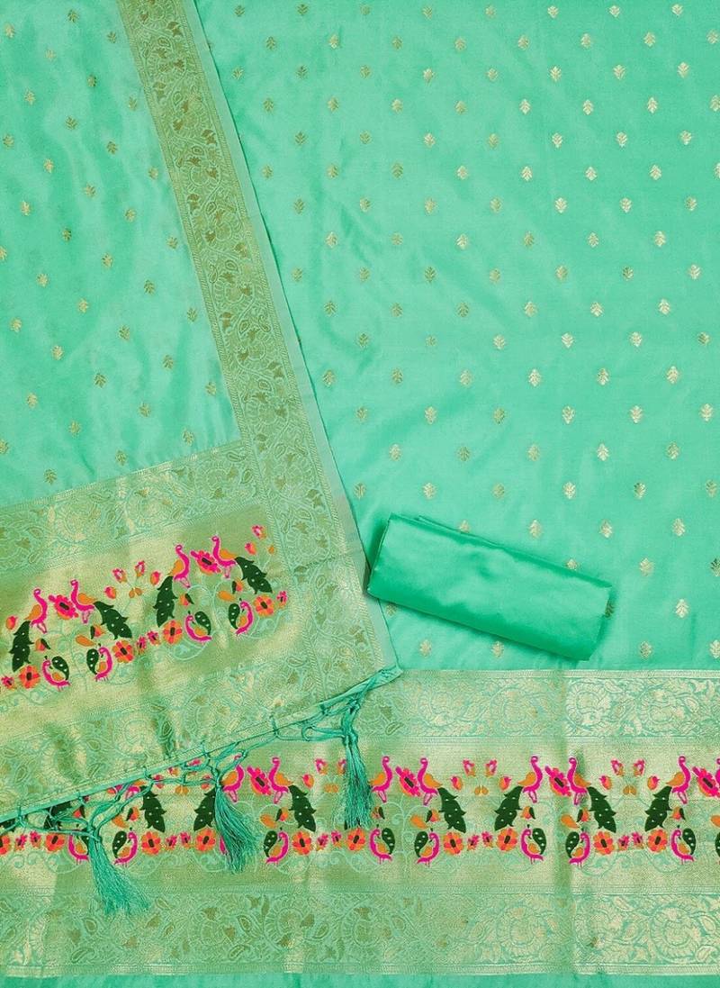 Sea green soft banarasi silk pure zari woven design dress material unstitched