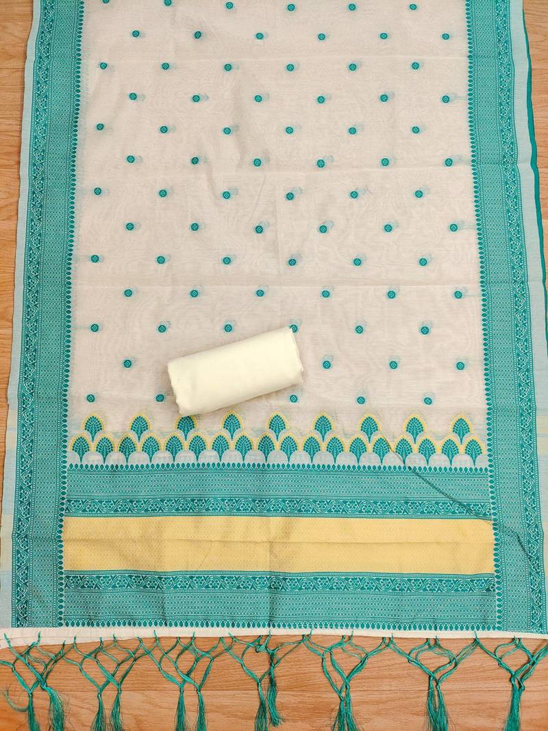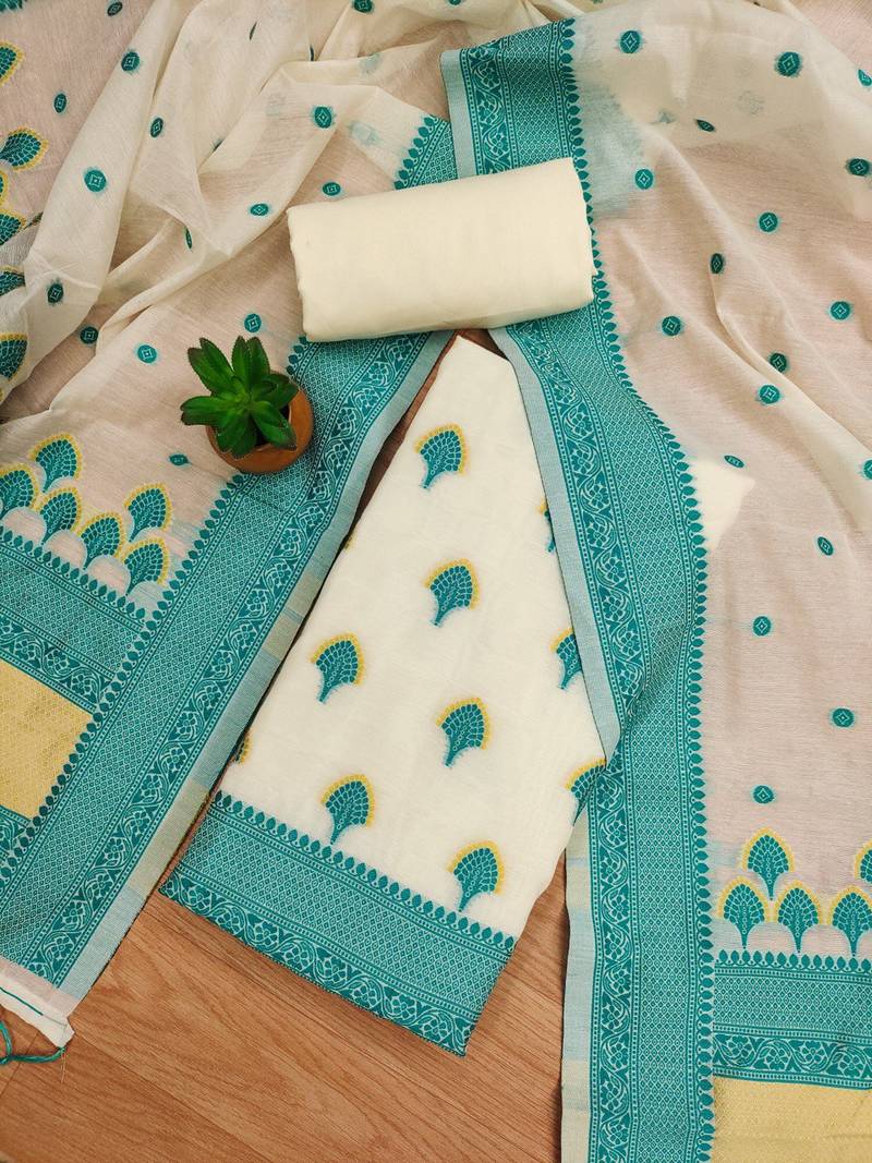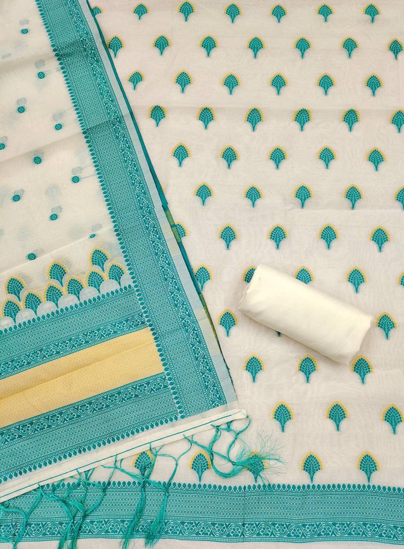 Teal chanderi cotton 3-piece resham weaving dress material unstitched