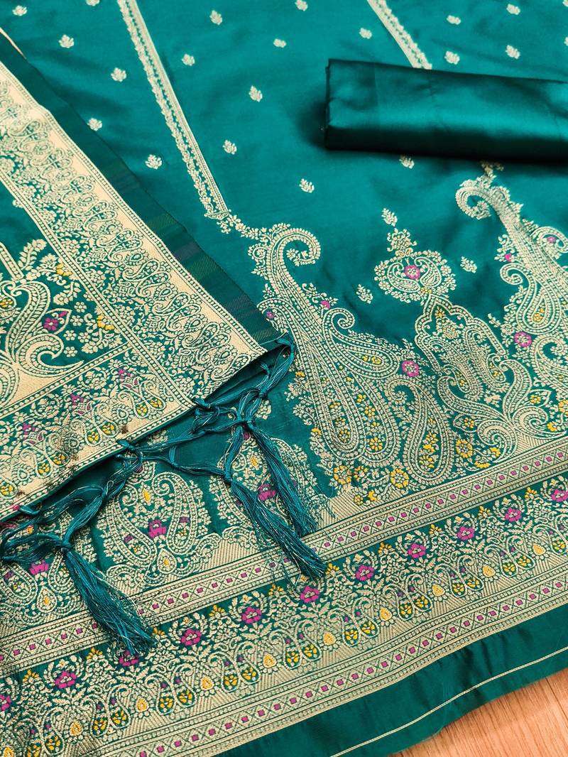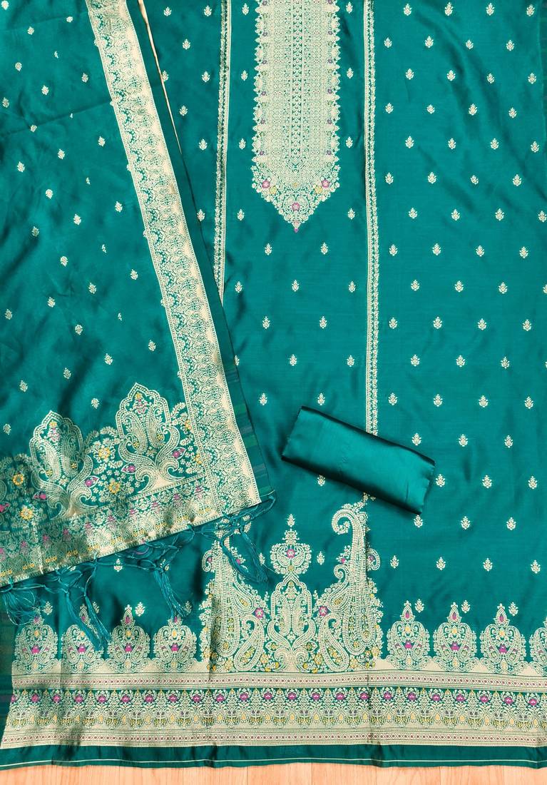 | Product Name | Teal Soft Banarasi Silk Pure Zari Woven Design Dress Material | |