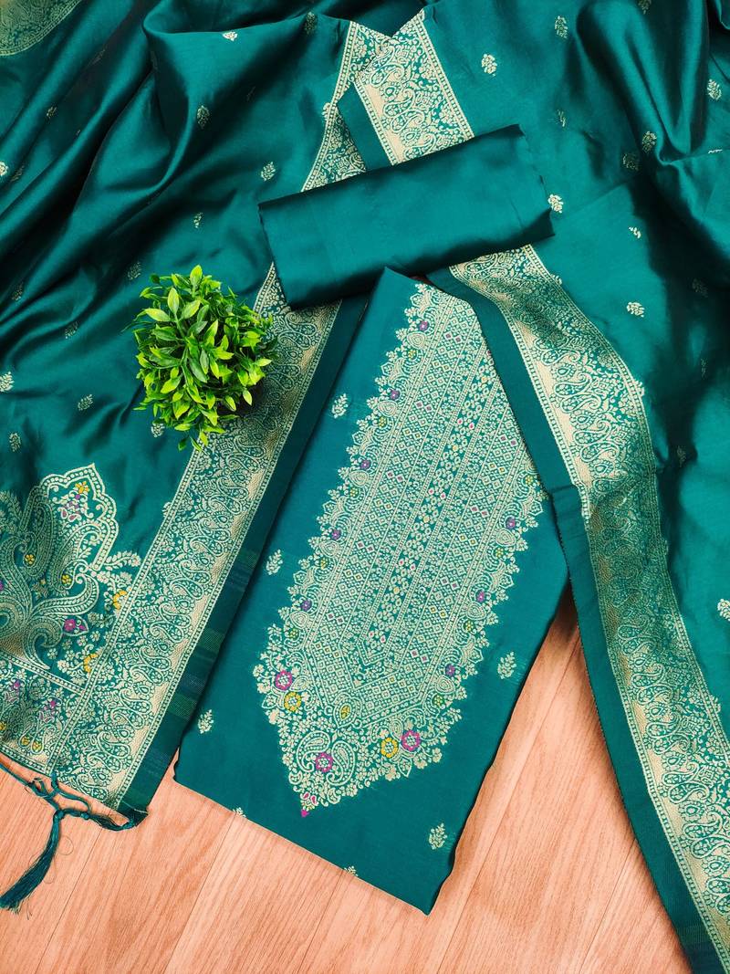 Teal soft banarasi silk pure zari woven design dress material unstitched