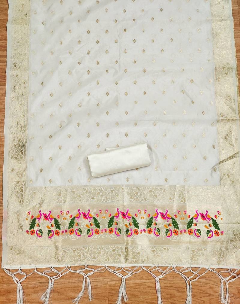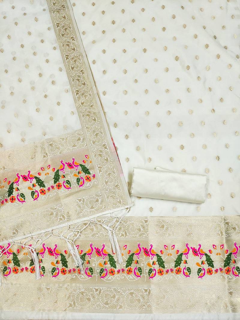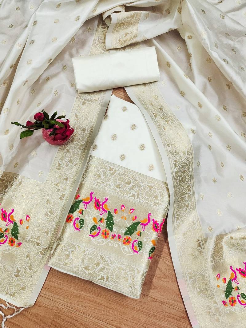 | Product Name | White Soft Banarasi Silk Pure Zari Woven Design Dress Material | |