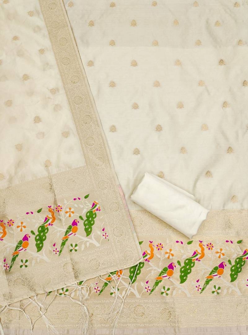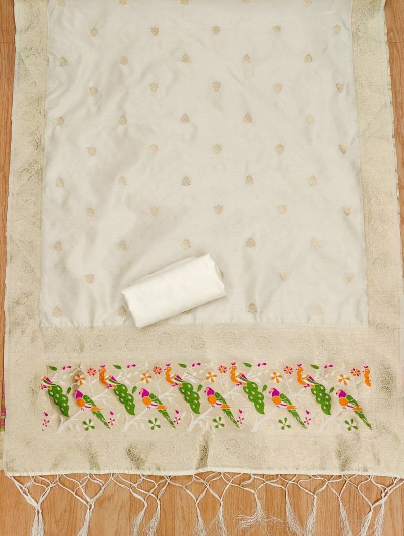 | Product Name | White Soft Banarasi Silk Pure Zari Woven Design Dress Material | |