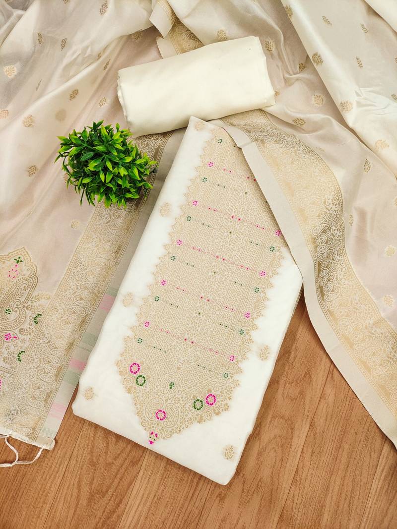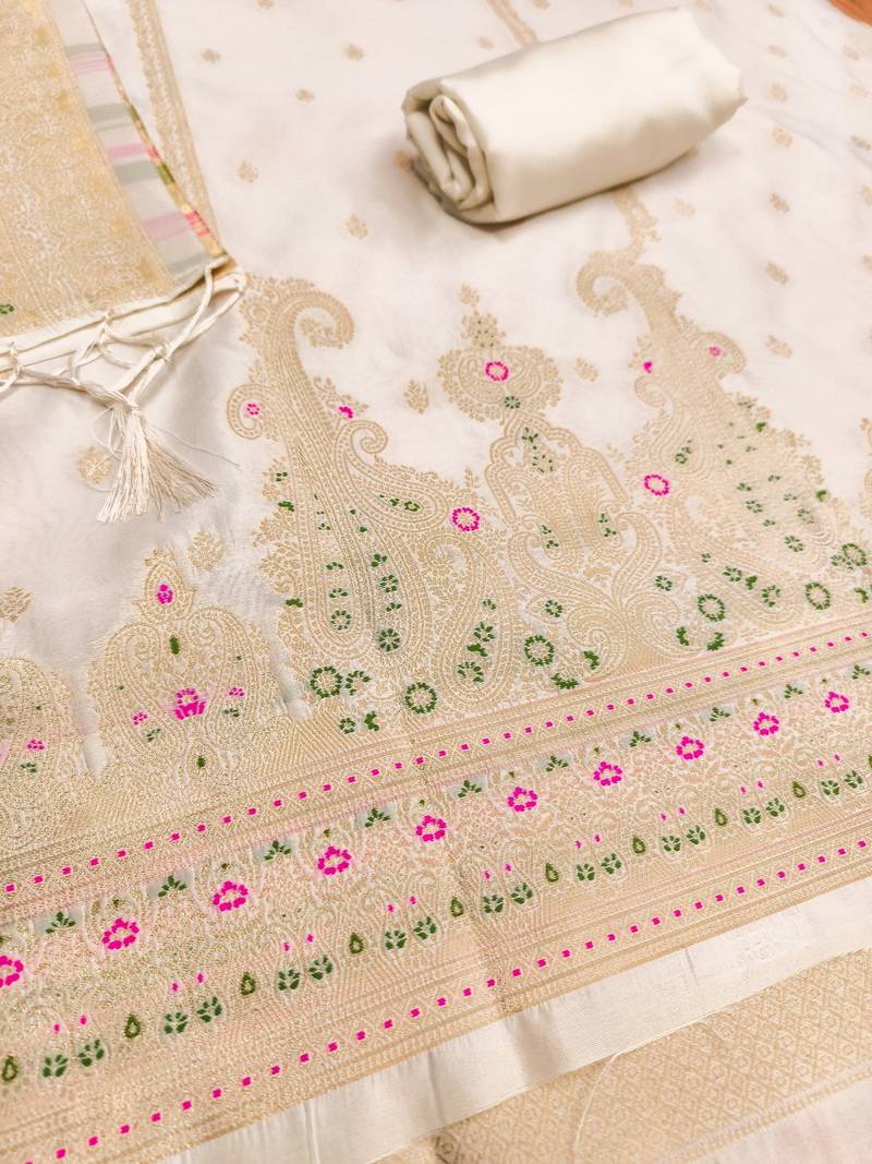 White soft banarasi silk pure zari woven design dress material unstitched