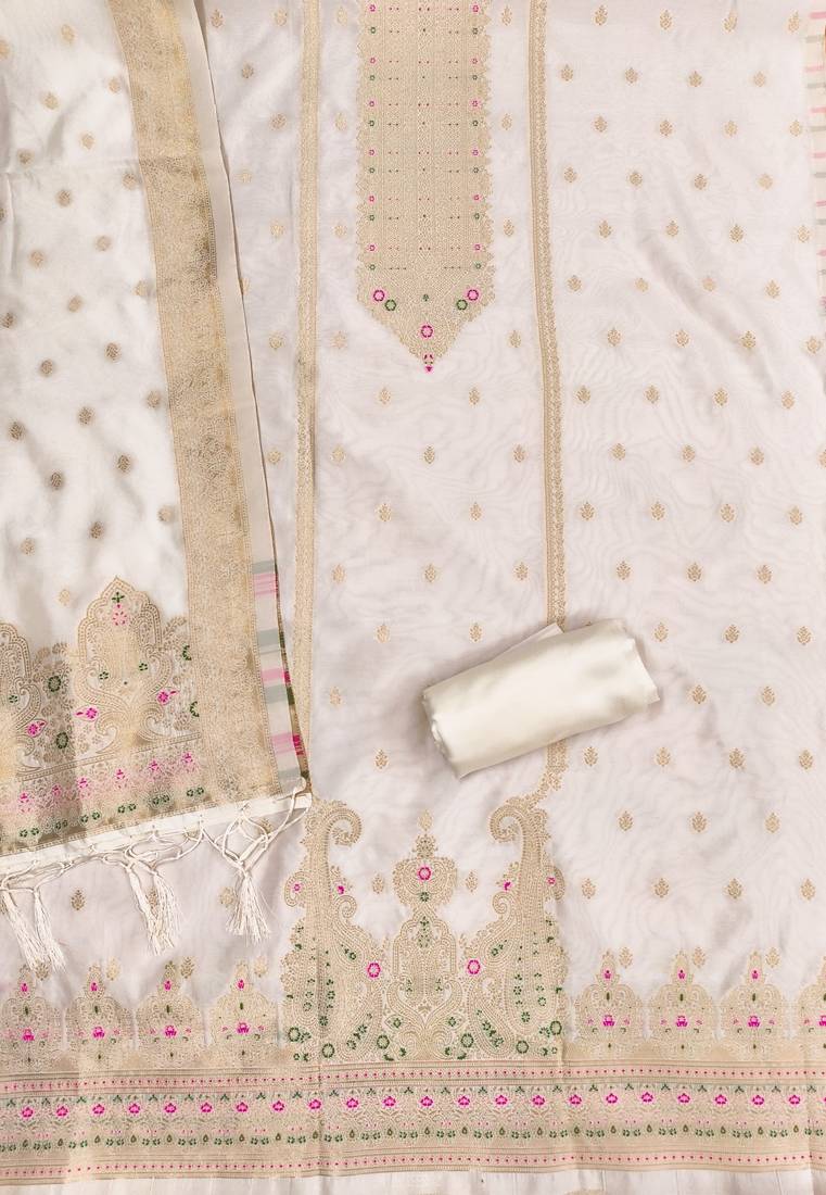 | Product Name | White Soft Banarasi Silk Pure Zari Woven Design Dress Material | |