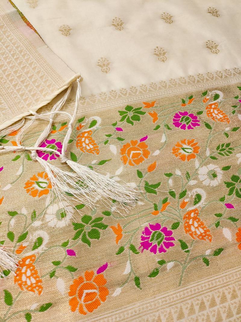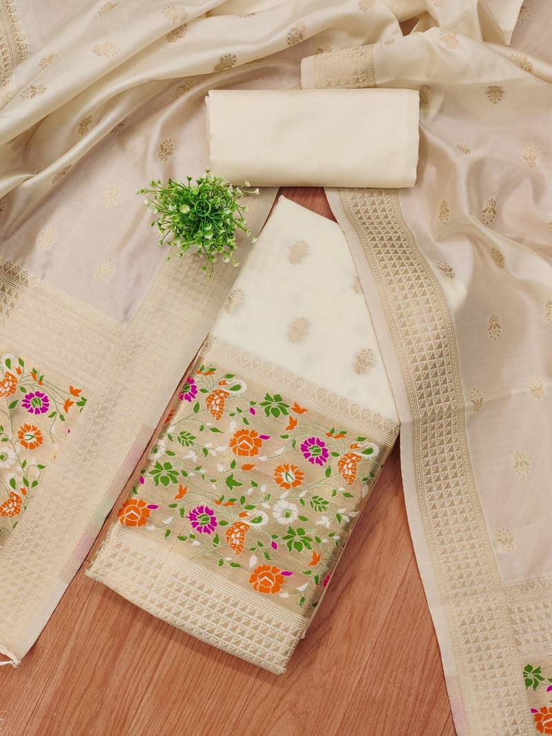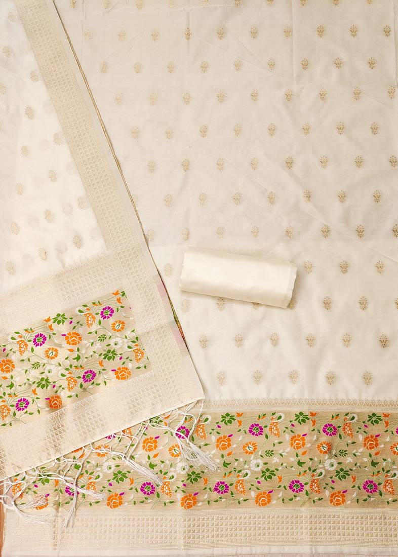 | Product Name | White Soft Banarasi Silk Pure Zari Woven Design Dress Material | |