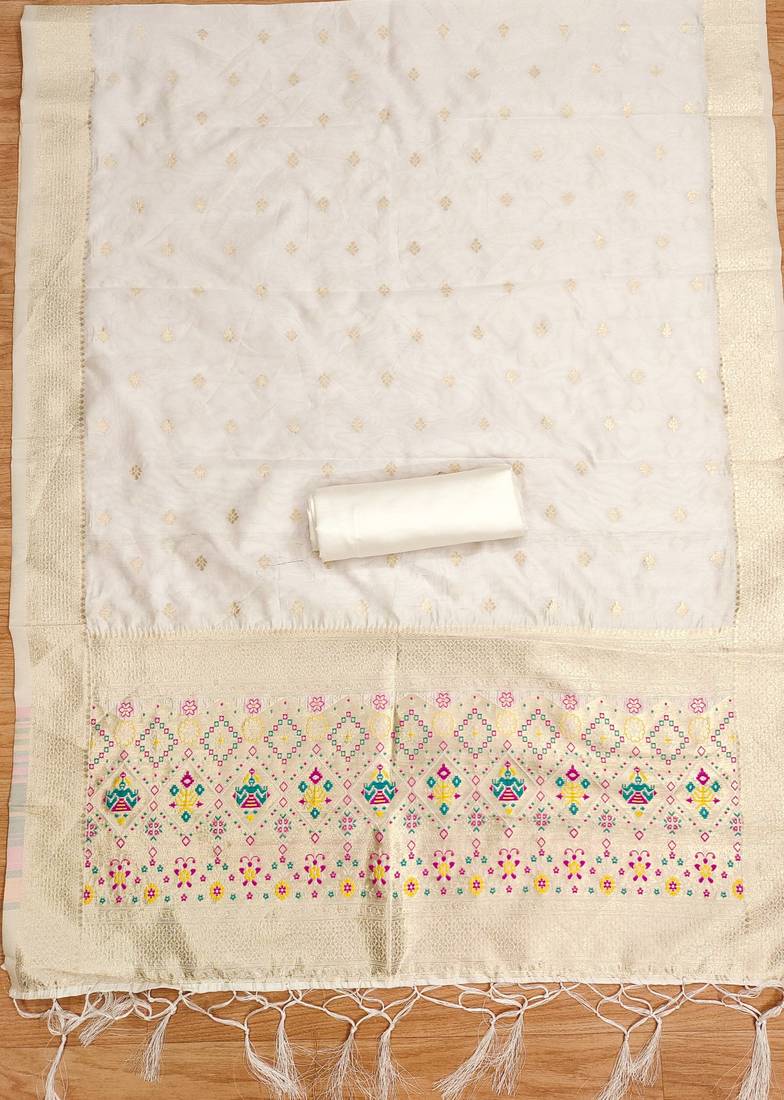 | Product Name | White Soft Banarasi Silk Pure Zari Woven Design Dress Material | |