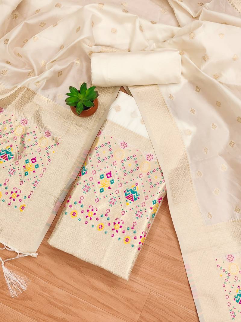 White soft banarasi silk pure zari woven design dress material unstitched
