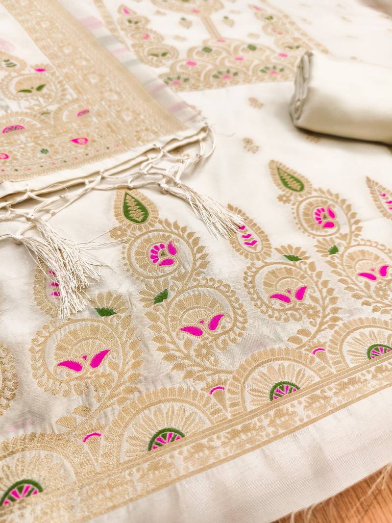 | Product Name | White Soft Banarasi Silk Pure Zari Woven Design Dress Material | |