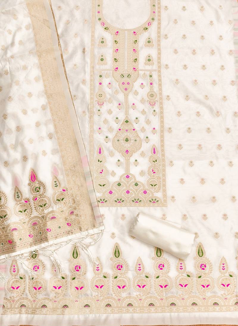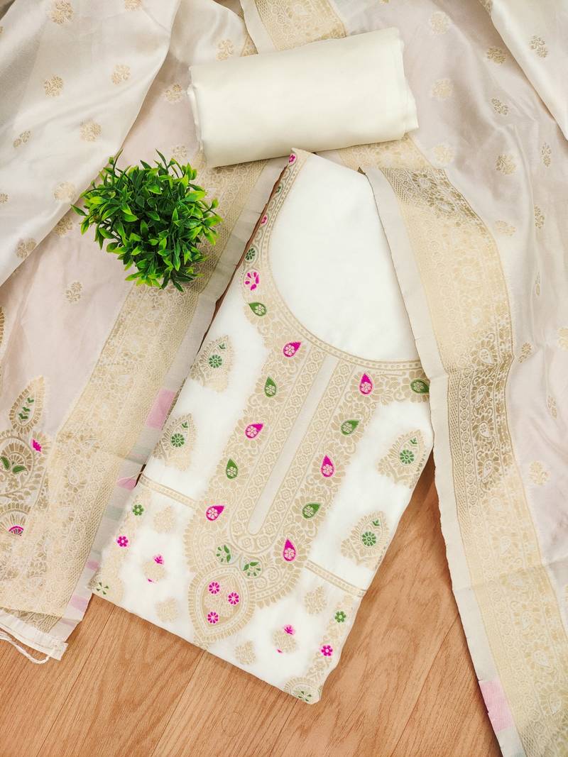 White soft banarasi silk pure zari woven design dress material unstitched