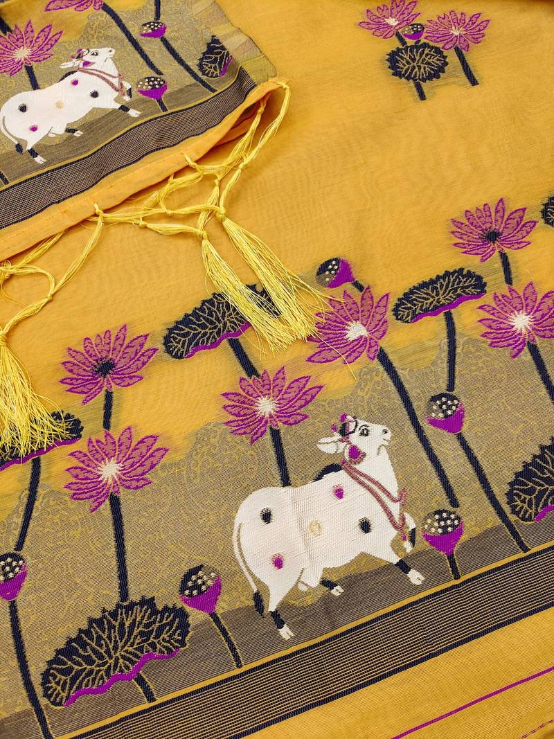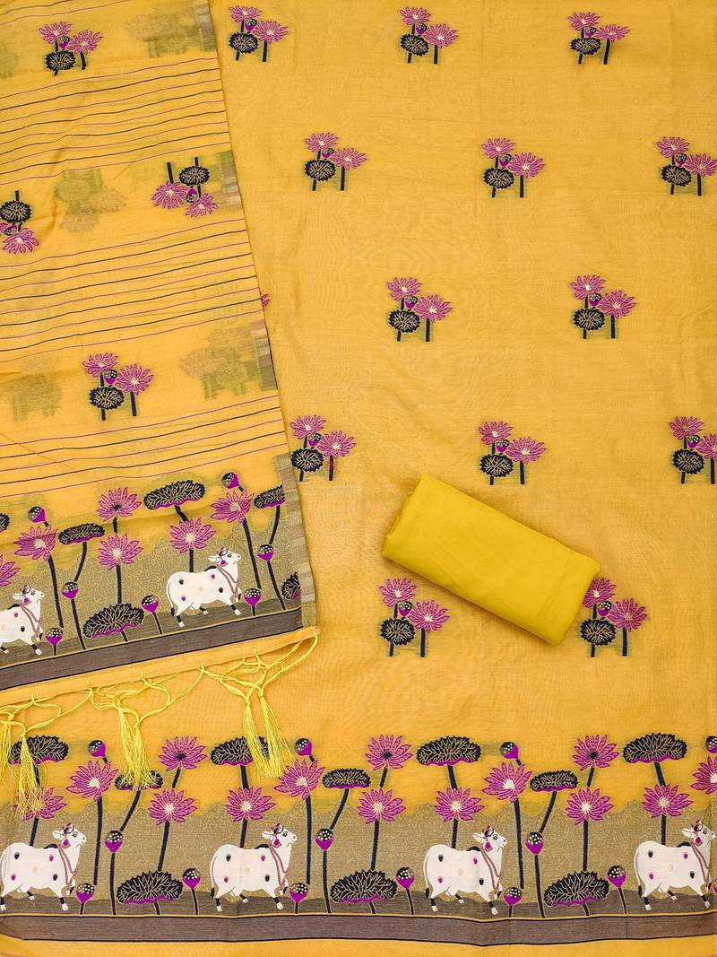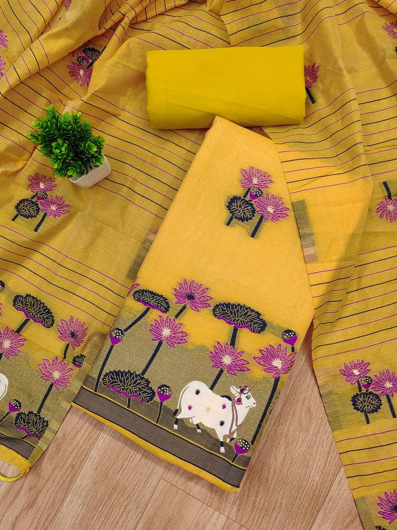 | Product Description | This Yellow Jamdani Weaving Muga Cotton 3 Piece Dress Material Set Brings A Beautiful Mix Of Tradition And Artistry. The Top Features Elegant Jamdani Motifs In Purple And Navy, Highlighted With Intricate Cow And Lotus Designs That Give It A Unique Handcrafted Charm. The Dupatta Comes With Coordinated Jamdani Weaving And Fine Striped Detailing, Adding A Graceful Flow To The Outfit. A Matching Plain Bottom Fabric Completes The Unstitched Set, Allowing You To Style It To Your Preferred Fit And Pattern. Perfect For Festive Wear, Cultural Events, And Special Gatherings, This Muga Cotton Dress Material Offers Comfort, Style, And A Rich Ethnic Appeal In One Premium Set. |