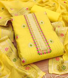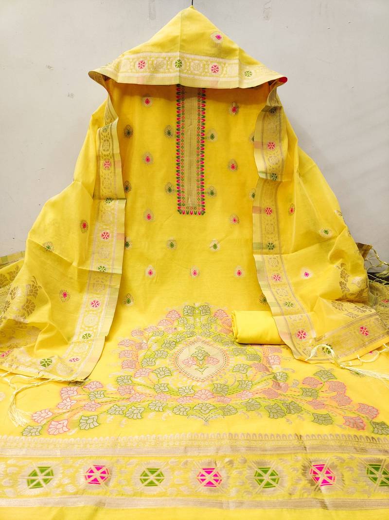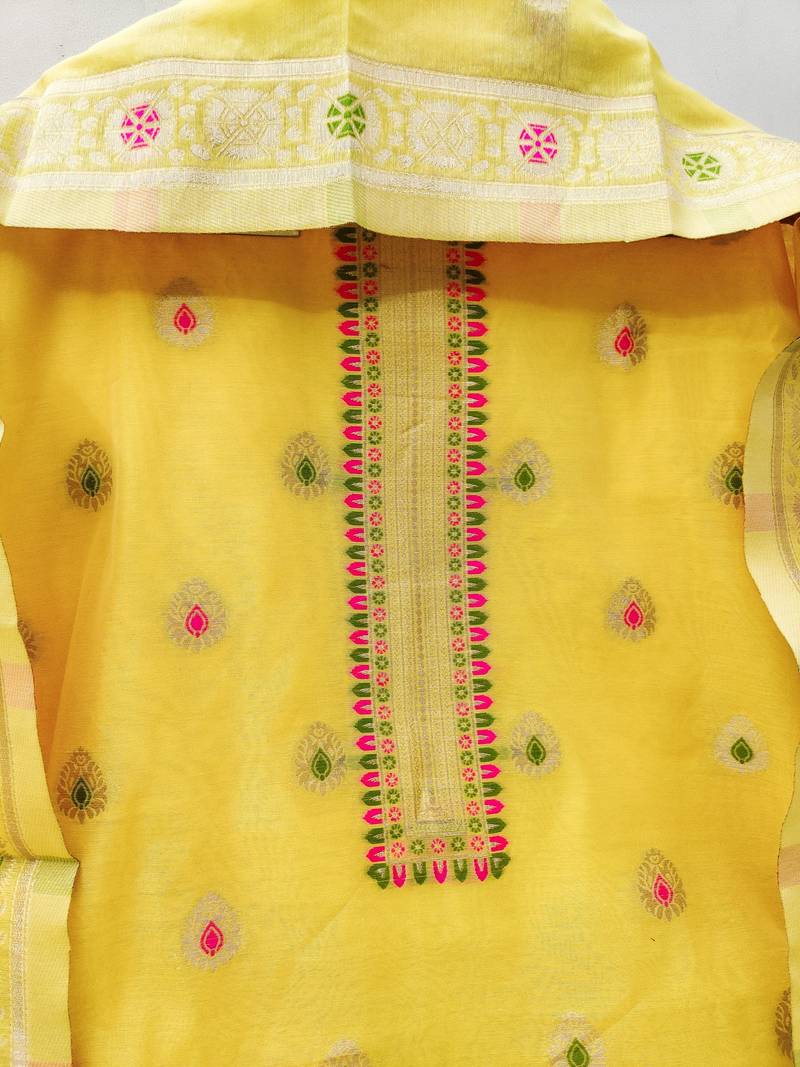 Yellow chanderi cotton zari weaving dress material set unstitched