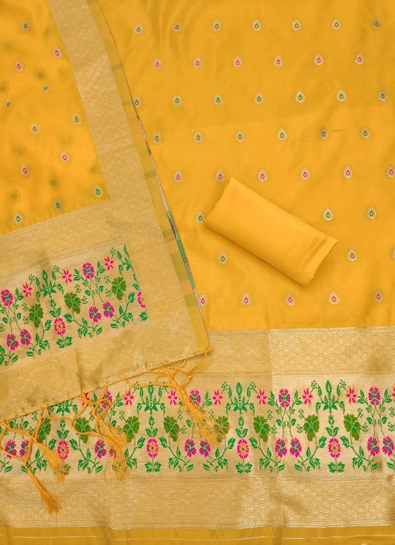 | Product Name | Yellow Soft Banarasi Silk Pure Zari Woven Design Dress Material | |