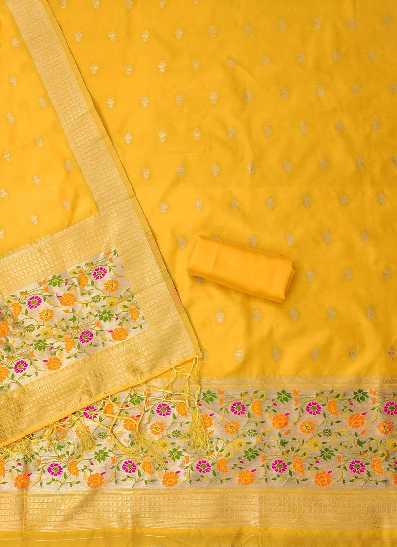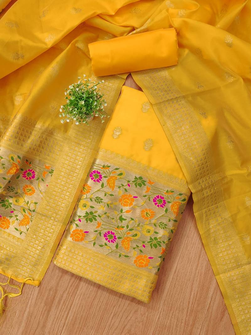 Yellow soft banarasi silk pure zari woven design dress material unstitched