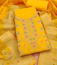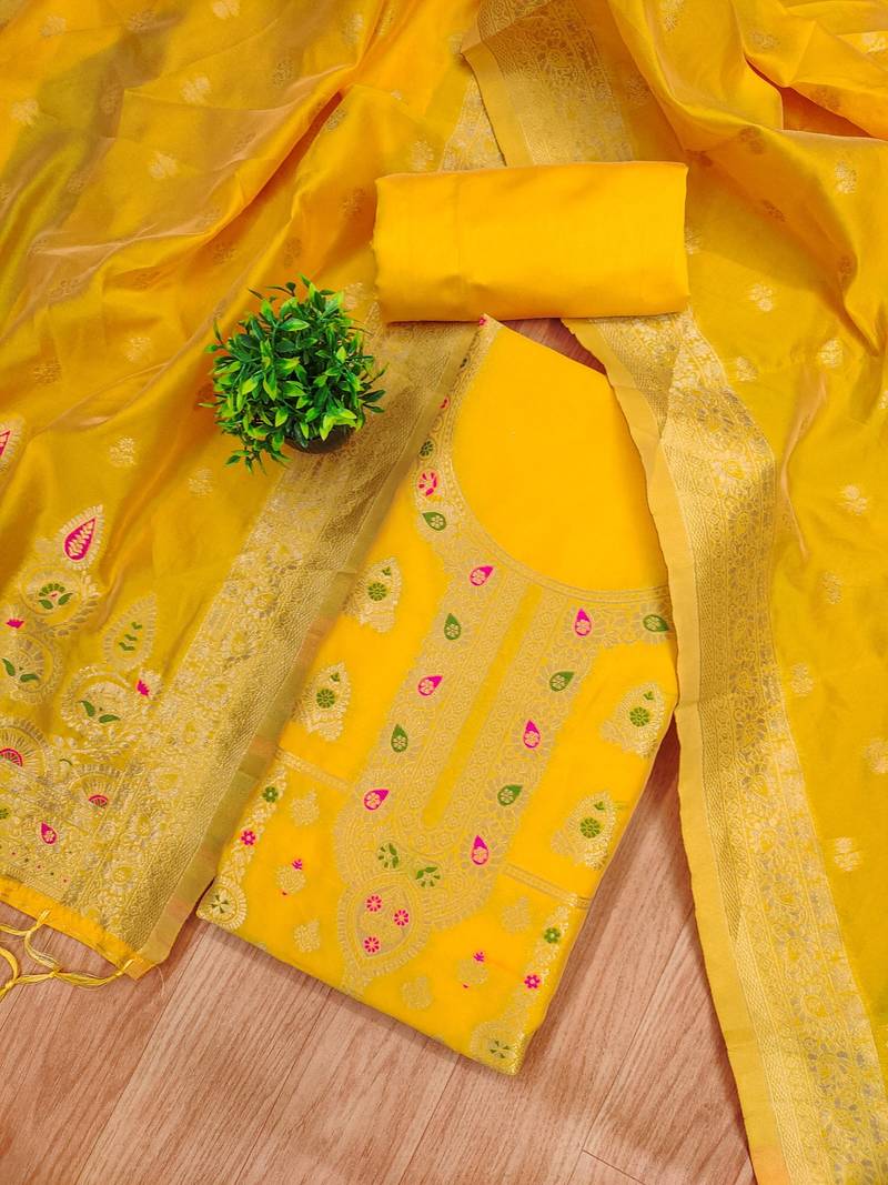 Yellow soft banarasi silk pure zari woven design dress material unstitched