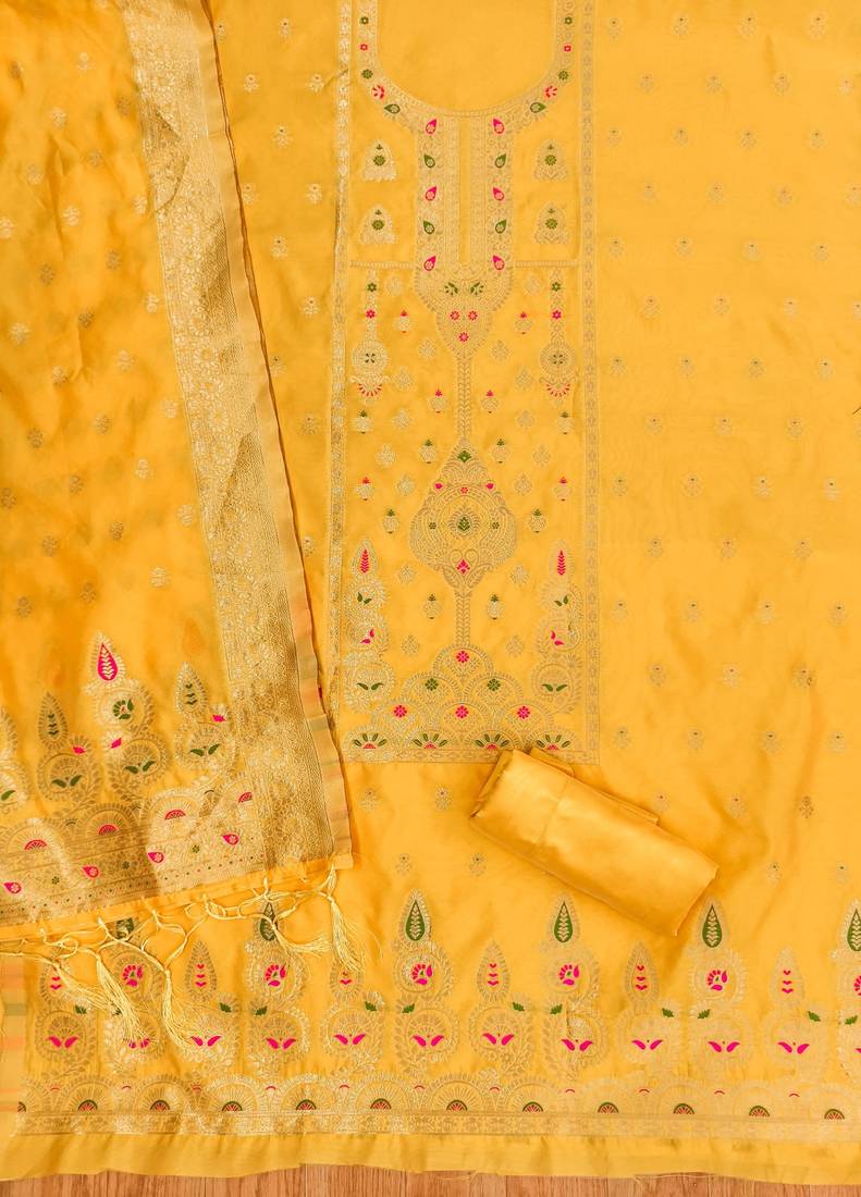 | Product Name | Yellow Soft Banarasi Silk Pure Zari Woven Design Dress Material | |