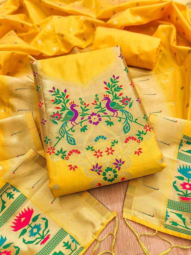 Yellow soft banarasi silk pure zari woven design dress material unstitched