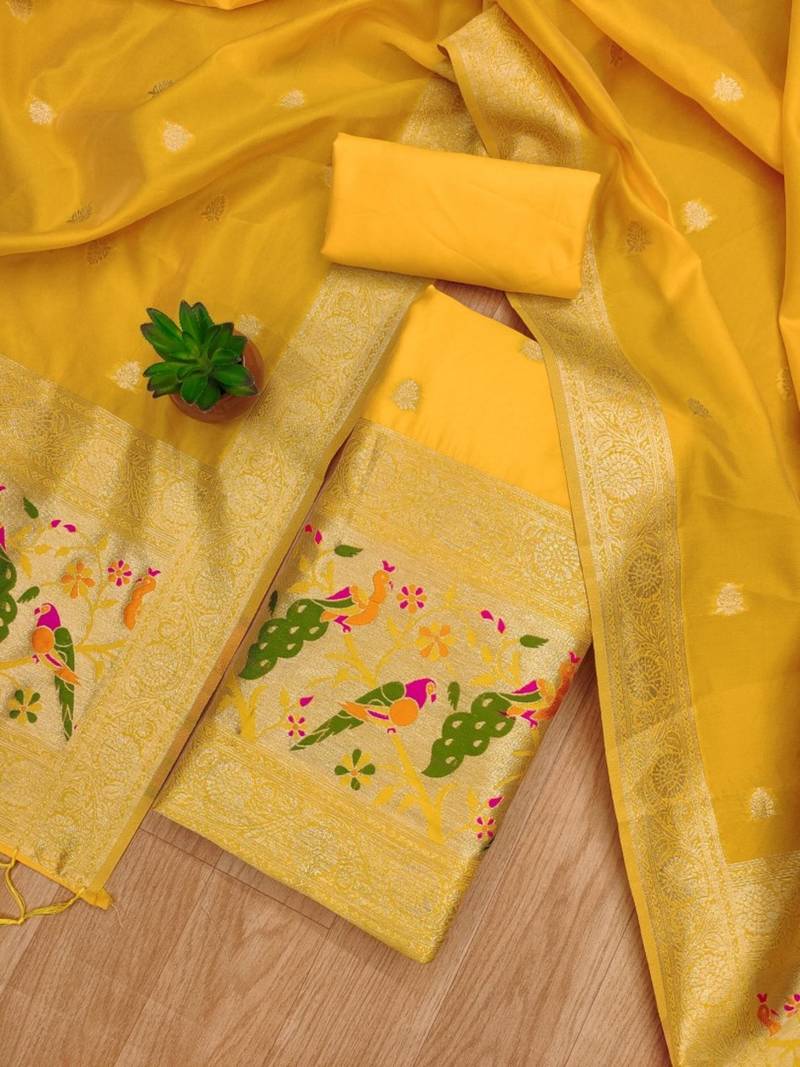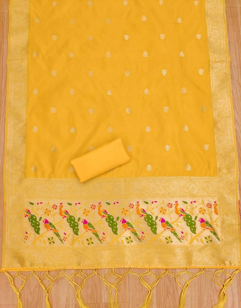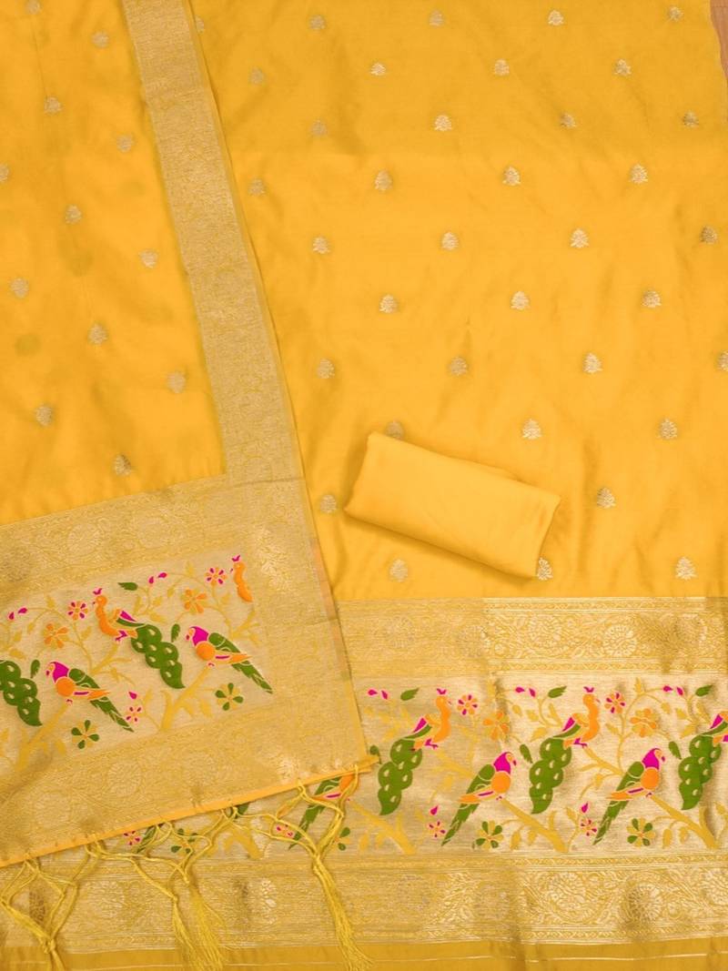 | Product Name | Yellow Soft Banarasi Silk Pure Zari Woven Design Dress Material | |