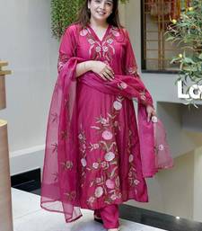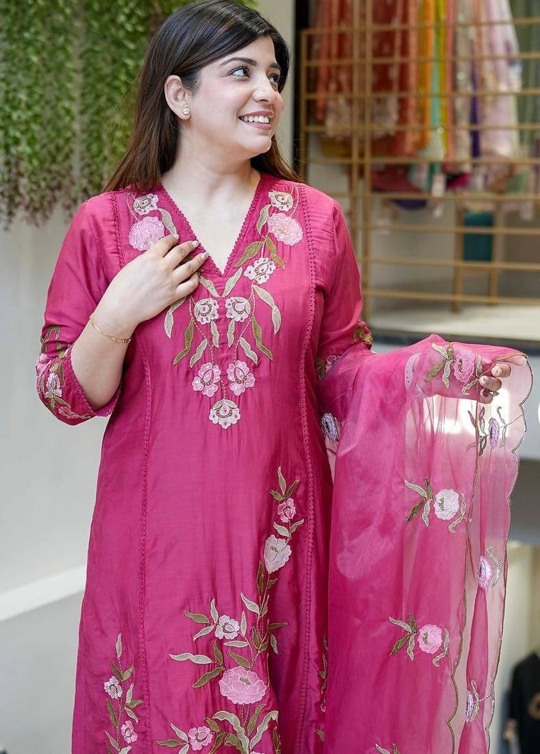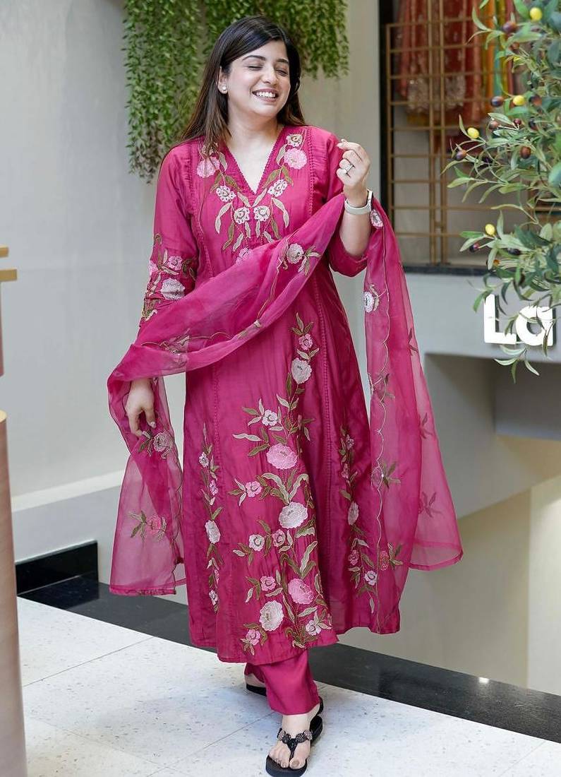 This Salwar Suit Set With Dupatta Is Elevated By A Stunning Dark Pink Organza Kurta Set Style Dupatta, Featuring Intricate Embroidery That Adds A Layer Of Ethereal Grace. Whether You Are Dressing Up For A Festive Diwali Kurti Look, An Eid Kurti Celebration, Or A Wedding Event, This Silk Kurta Set For Women Ensures You Stand Out. Far More Sophisticated Than Basic Cotton Kurtis, This Ensemble Functions As A Complete Women's Indian Salwar Kameez Set, Blending The Tradition Of Ethnic Kurtis With The Modern Appeal Of A Kurta Pant Set For Women. Experience The Perfect Fusion Of Style And Heritage With This Premium Party Wear Kurta Set.