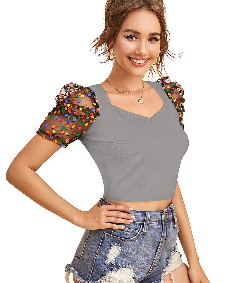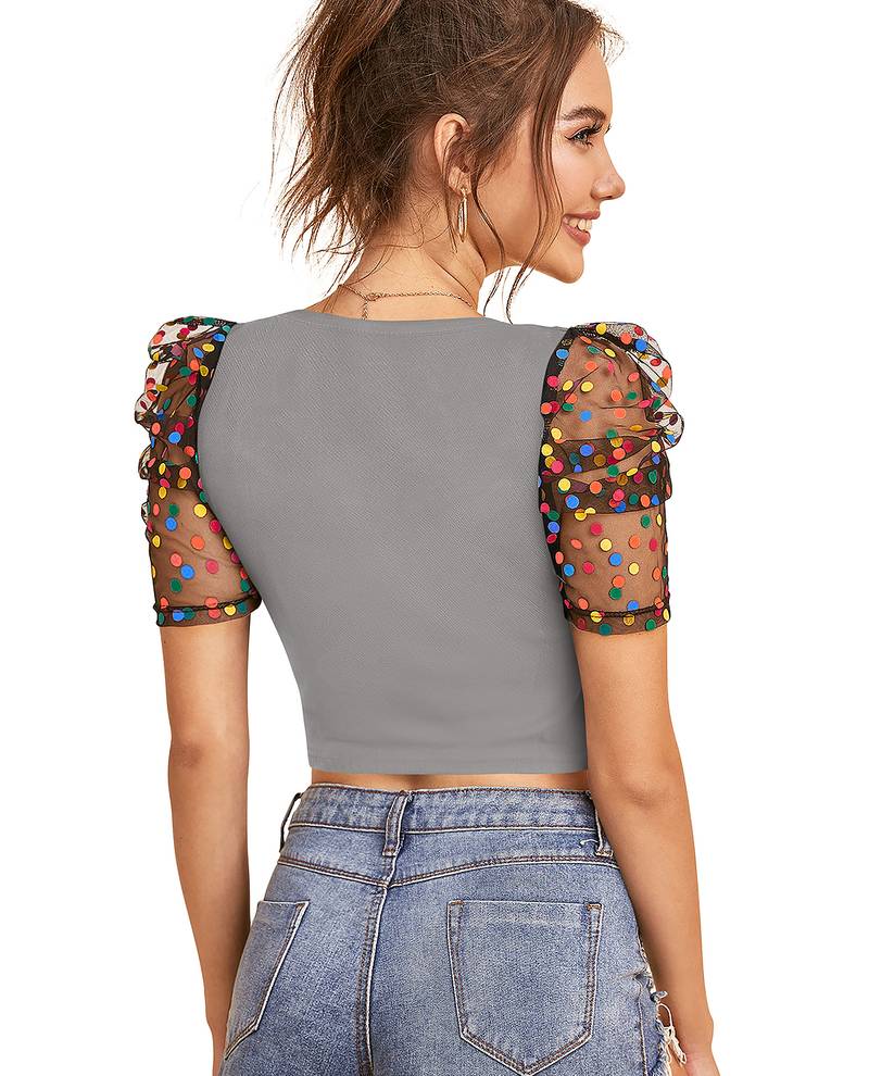 | Product Name | Grey Dot Printed Puff Sleeve Crop Top For Women Aesthetic V Neck Designer Top | |