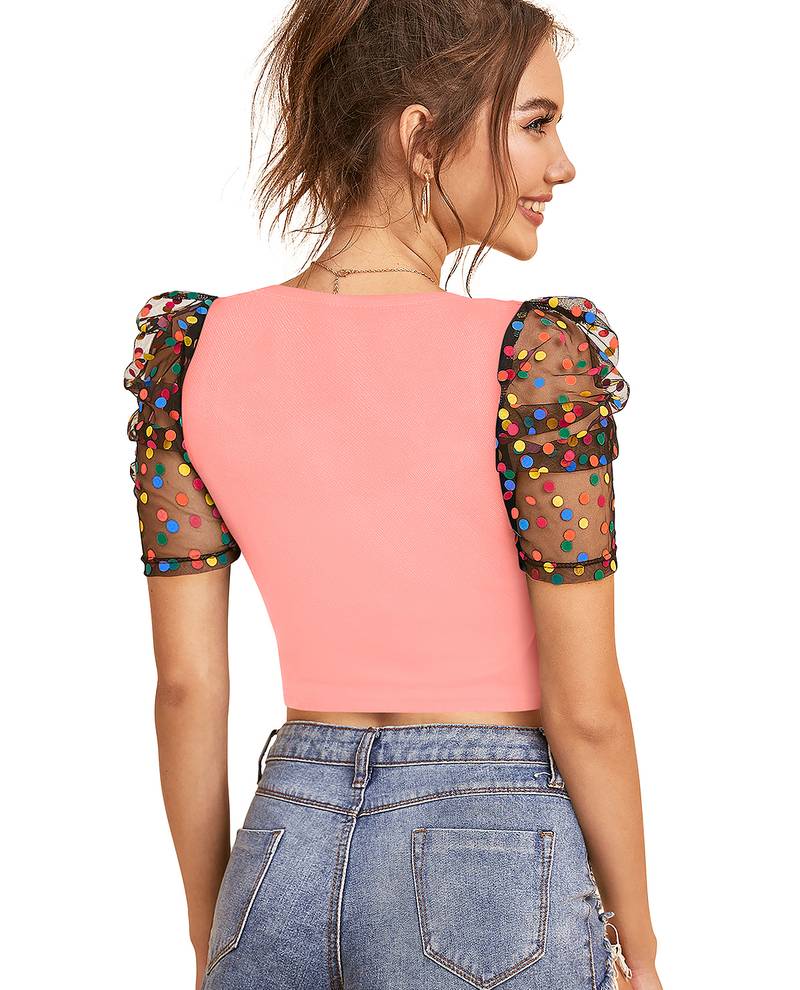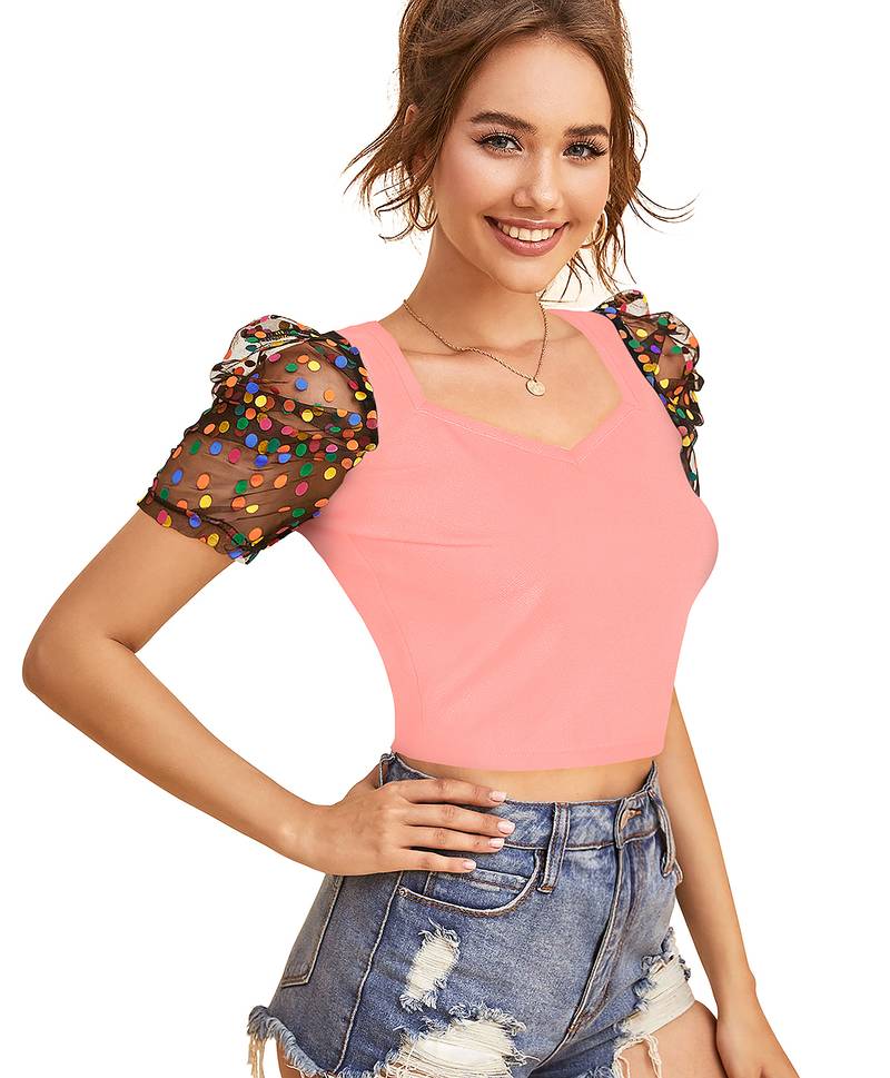 | Product Name | Peach Dot Printed Puff Sleeve Crop Top For Women Aesthetic V Neck Designer Top | |