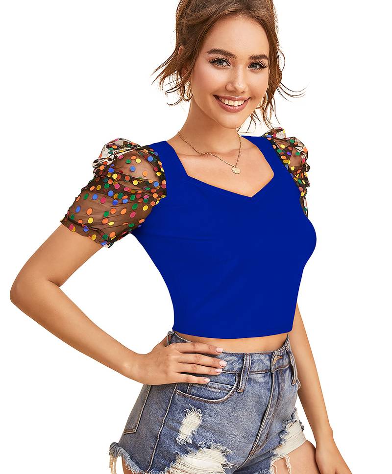 | Product Name | Royal Blue Dot Printed Puff Sleeve Crop Top For Women Aesthetic V Neck Designer Top | |