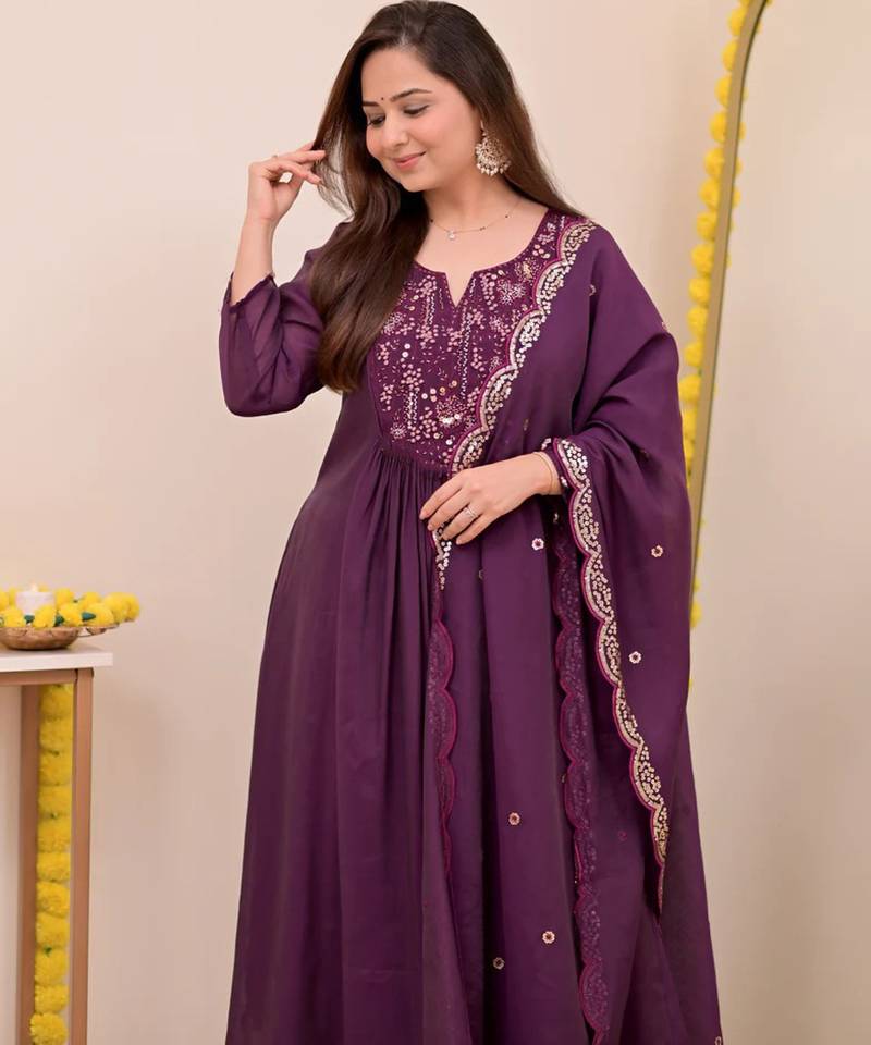 Step Into A World Of Royal Elegance With Our Women’s Chanderi Silk Sequin Embroidery Round Neck Purple Kurta Pant Set. This Exquisite Readymade Suit Is A Celebration Of Traditional Craftsmanship Meeting Modern Tailoring, Offering A Sophisticated Alternative To A Classic Anarkali Suit Or Churidar Suit. Crafted From Premium Chanderi Silk, The Kurta Features A Classic Round Neckline Adorned With Meticulous Sequin Embroidery, Making It A Standout Choice For Those Who Appreciate Heavy Work Kurtis And Embroidered Kurtis. The Deep, Majestic Purple Hue Makes It A Quintessential Eid Kurti Or Diwali Kurti, Radiating Timeless Charm And Grace.