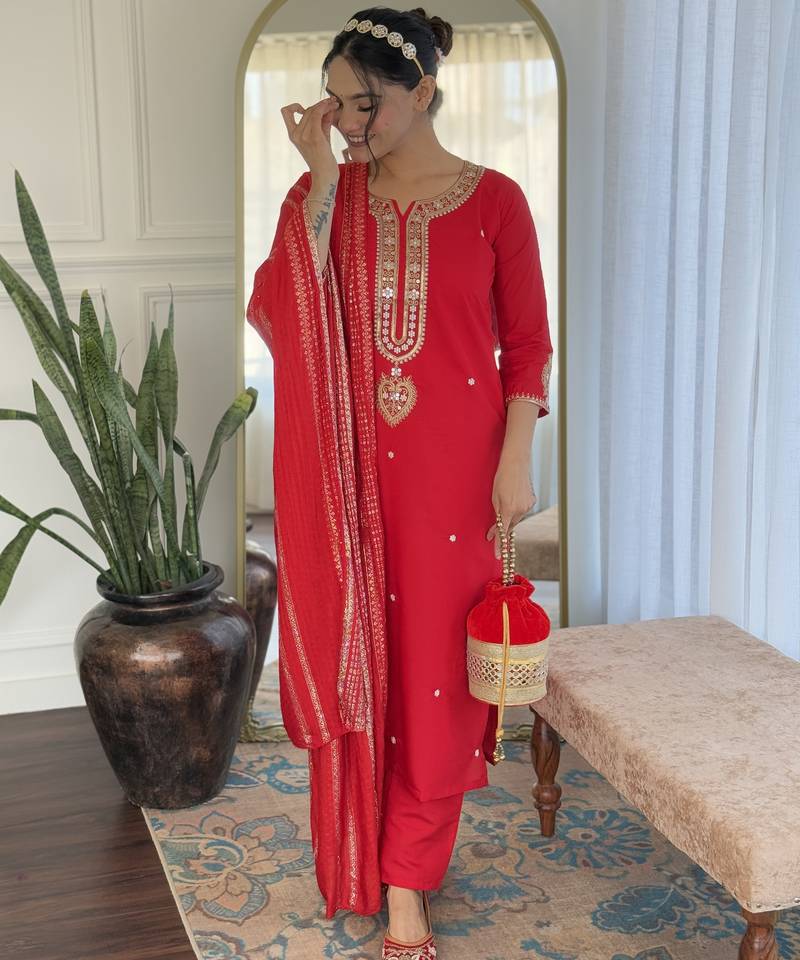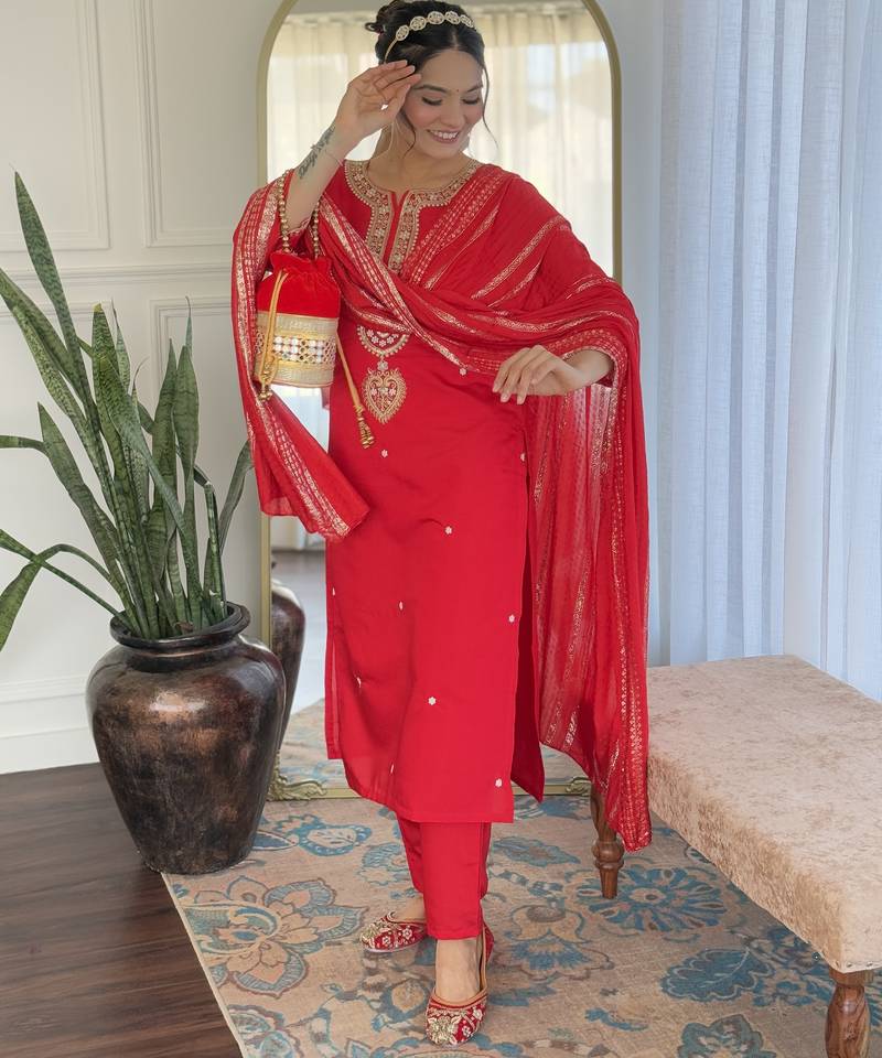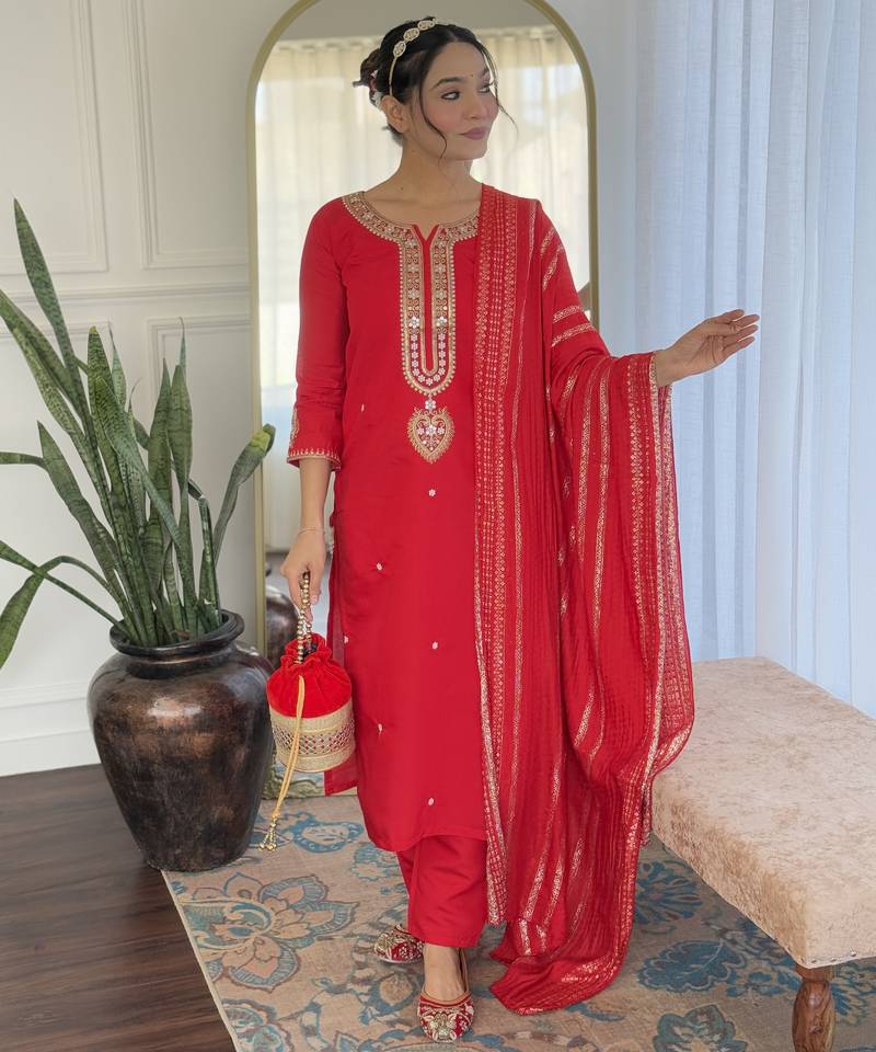 Turn Every Occasion Into A Celebration With This Stunning Red Kurta Pant Set For Women, Beautifully Crafted From Premium Viscose Chanderi Fabric That Offers A Soft Feel And Elegant Sheen. Designed With A Flattering V Neck, The Kurta Is Enhanced With Intricate Sequin And Stone Embroidery That Adds Festive Sparkle And Luxurious Detailing. The Coordinated Tailored Pant Provides A Sleek And Comfortable Silhouette, While The Rich Viscose Jacquard Dupatta Completes The Ensemble With Woven Texture And Graceful Drape.