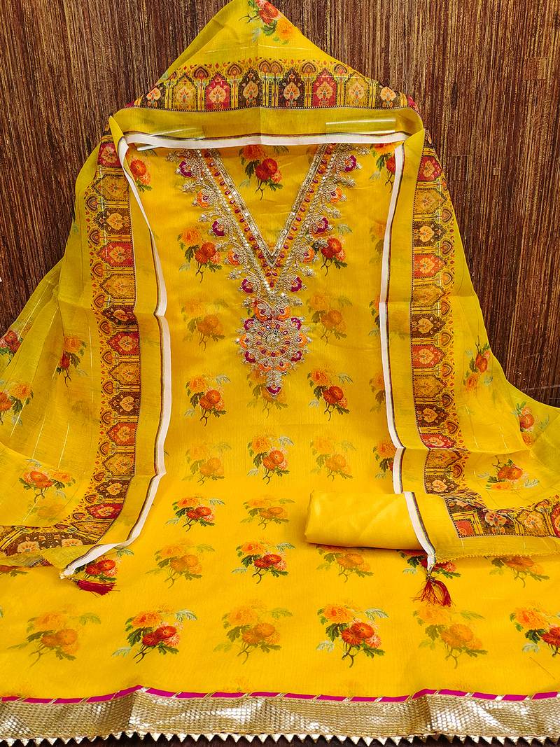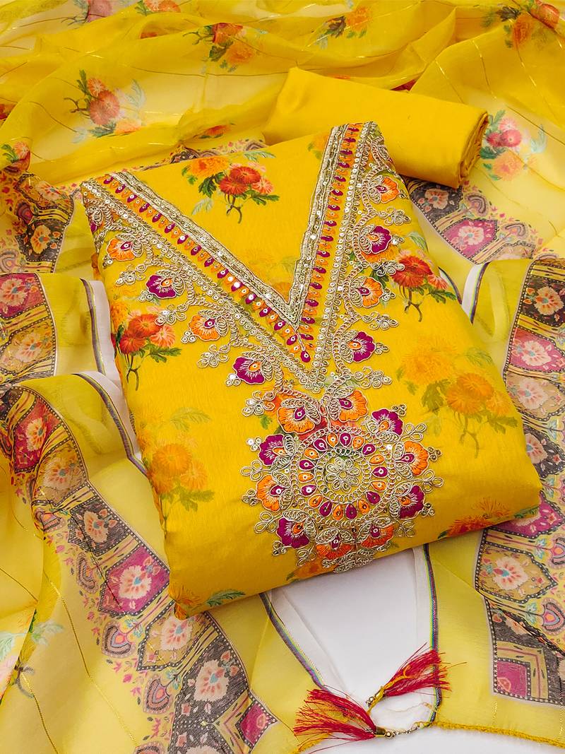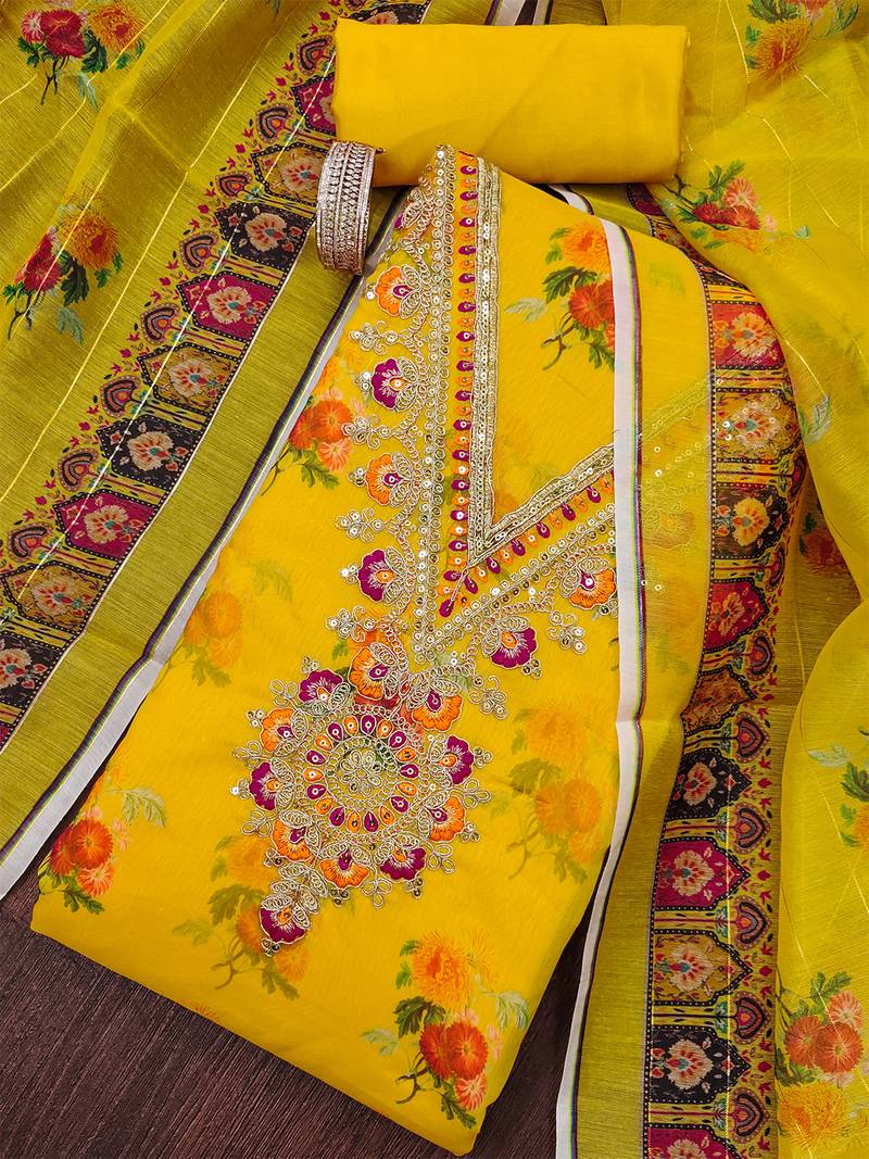 Product Description | This Unstitched Dress Material Set Is Designed For Elegance And Style. The Soft Fabric Features A Beautiful Floral Print Enhanced With Intricate Zari And Sequin Embroidery On The Neckline, Giving It A Festive And Graceful Look. The Set Includes A 2.5 Meter Top, 2 Meter Plain Bottom, And A 2.2 Meter Matching Dupatta With Printed Borders, Perfect For Creating A Customized Suit. Ideal For Casual Outings, Festive Gatherings, Or Parties, This Fabric Offers Comfort With A Rich Traditional Appeal. |