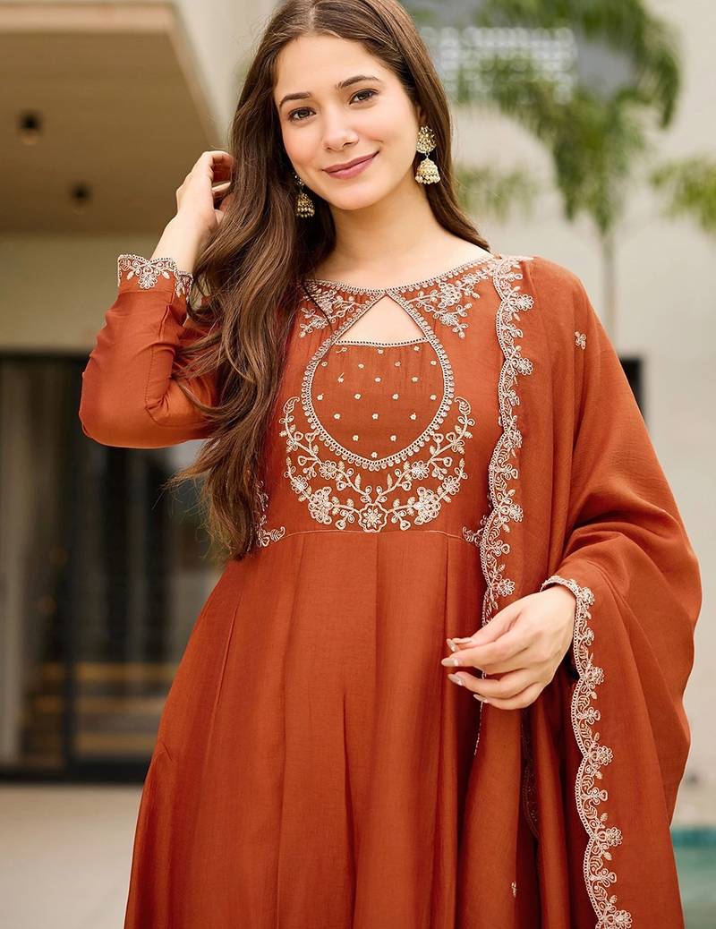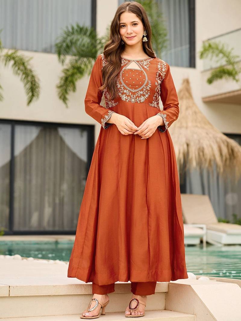 | Product Name | Elegant Rust Orange Vichitra Embroidered Anarkali Kurti Set | |