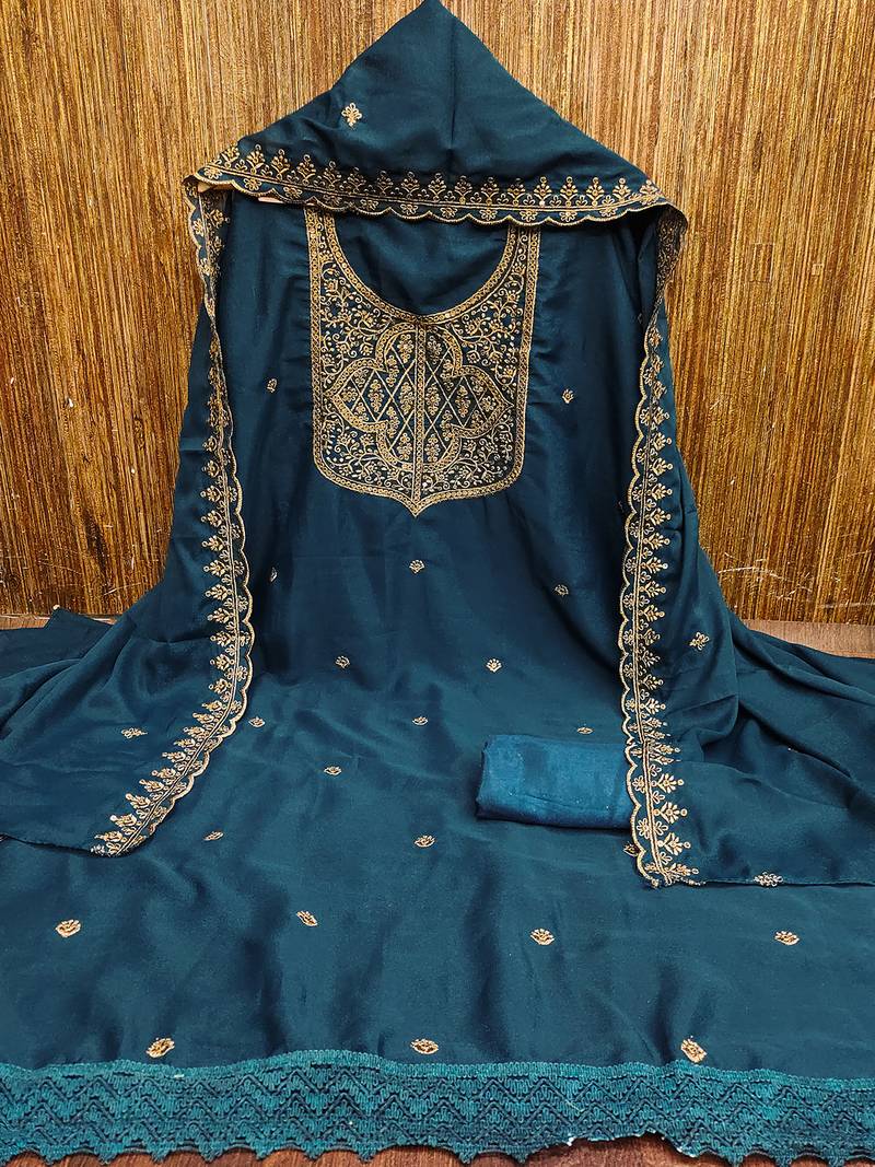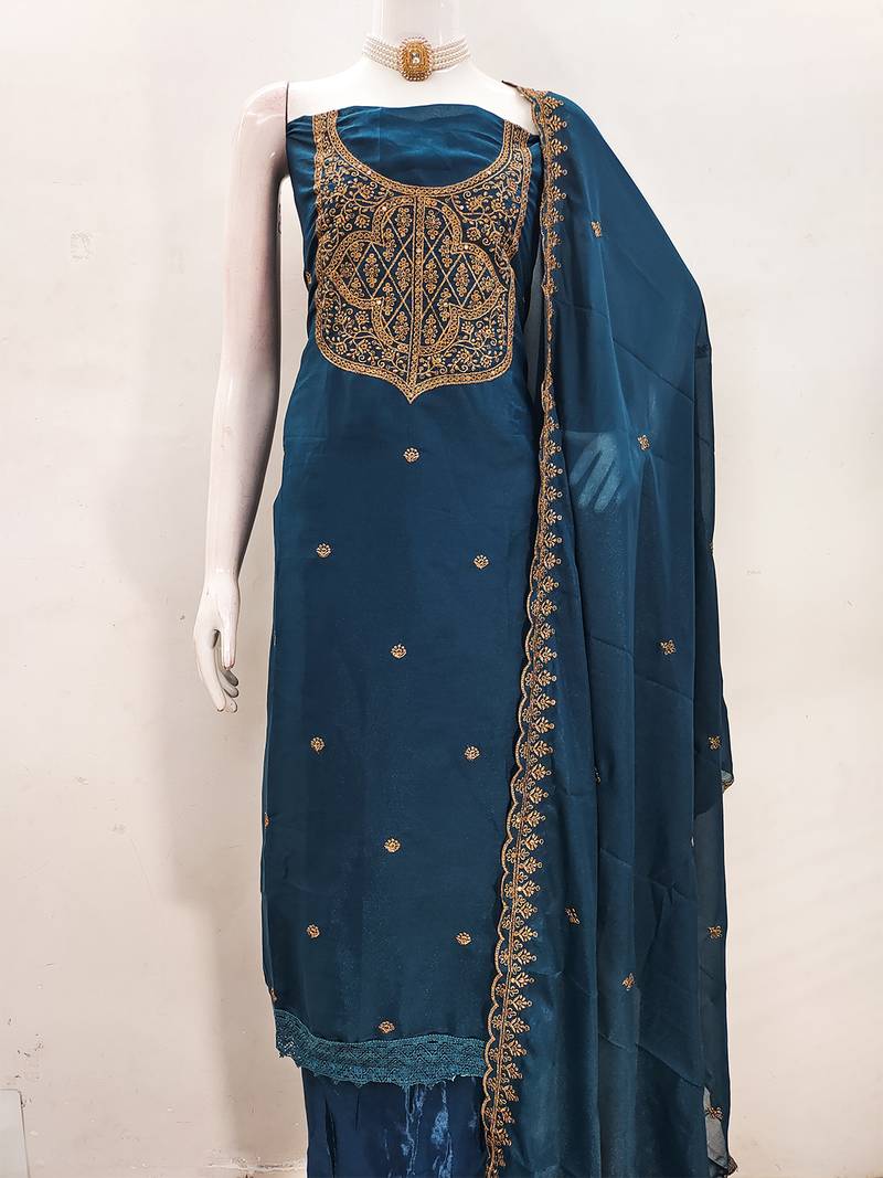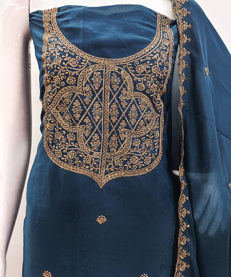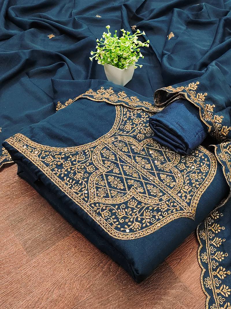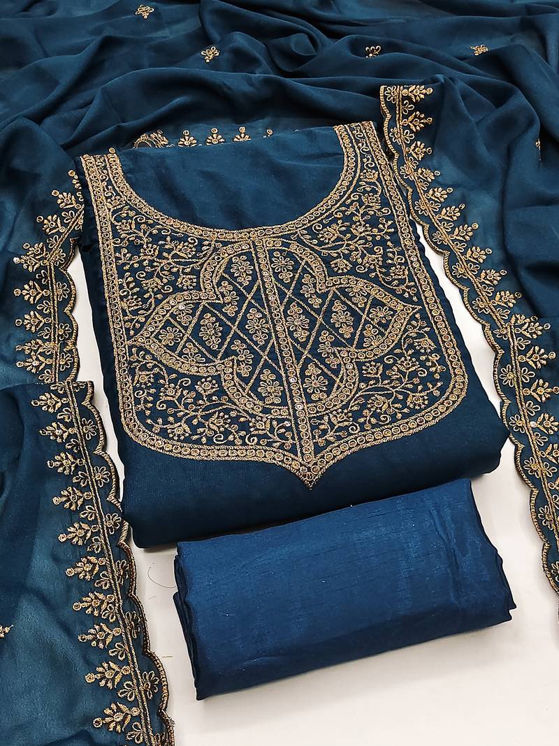 Product Description | This Beautiful Unstitched Suit Set Features Intricate Golden Thread Embroidery On The Neckline And Borders, Paired With A Delicately Embroidered Dupatta. The Luxurious Color And Elegant Detailing Make It Perfect For Festive Occasions, Weddings, And Special Events. Style It With Statement Earrings And Embellished Juttis For A Complete Ethnic Look. |