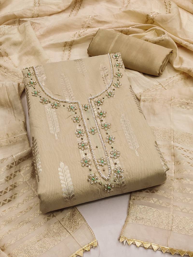 Women's beige silk blend banarasi jacquard embroidered unstitched