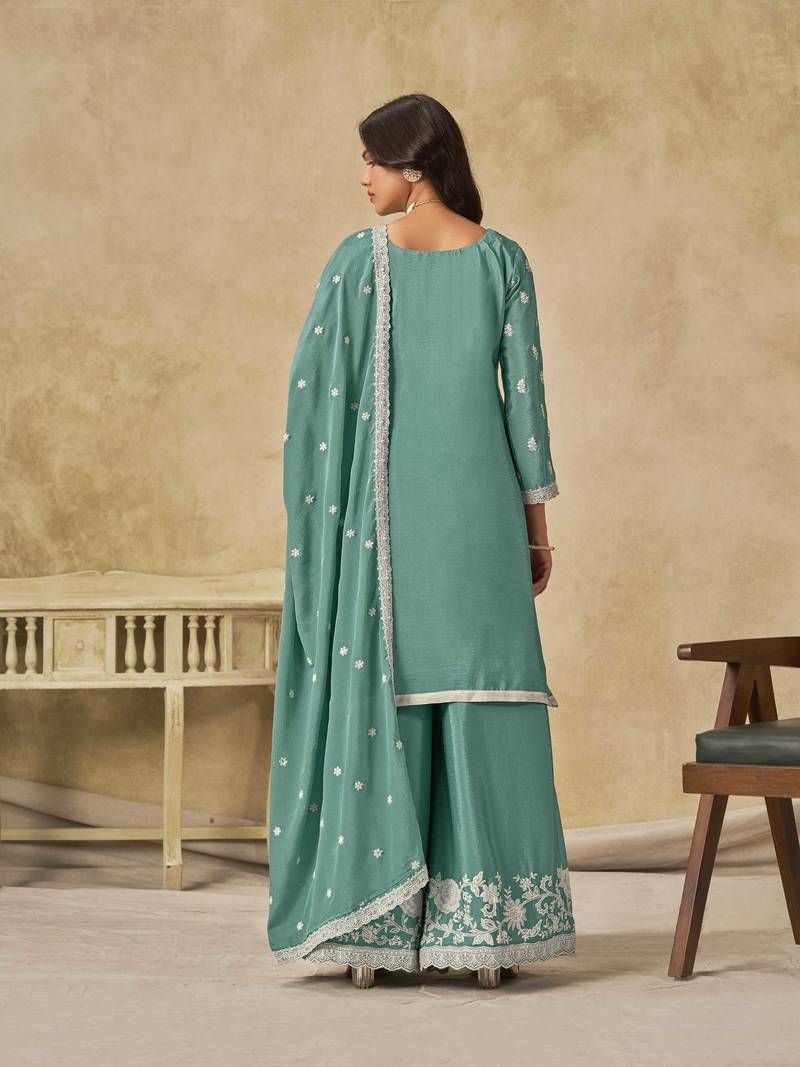 | Product Name | Aqua Blue Chinon Heavy Thread Embroidery Work Palazzo Suit | |