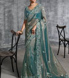 Aqua blue premium tissue zari resham thread embroidery with pearls, mirror work stone work saree with blouse