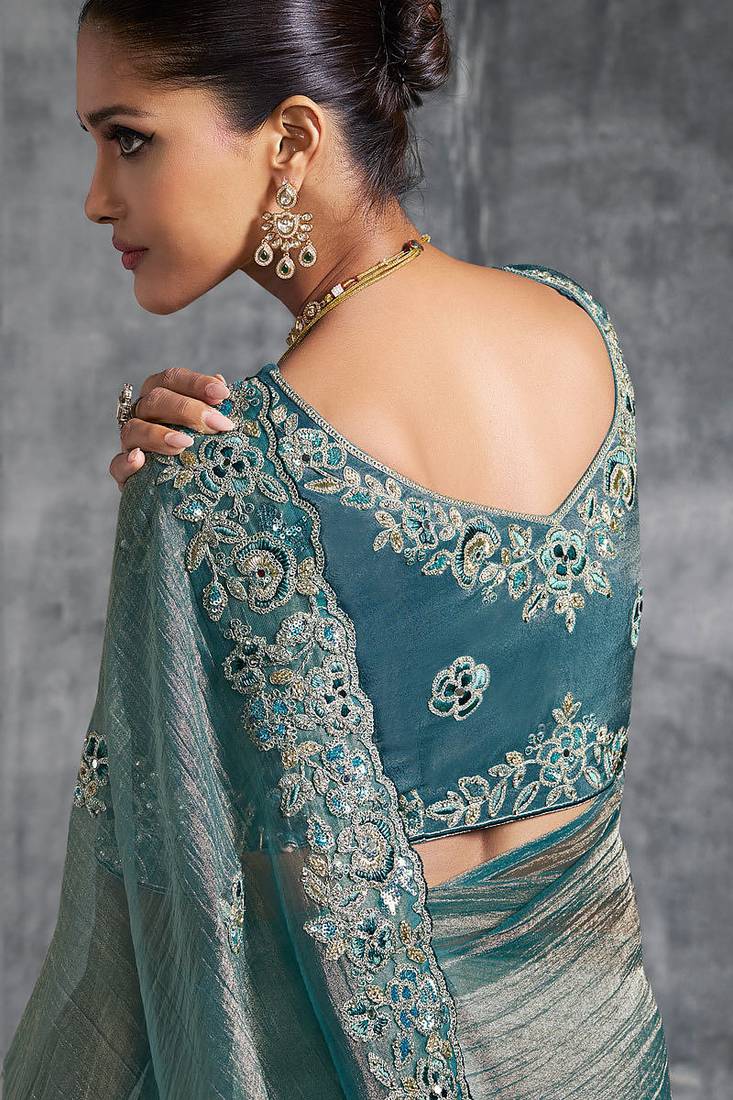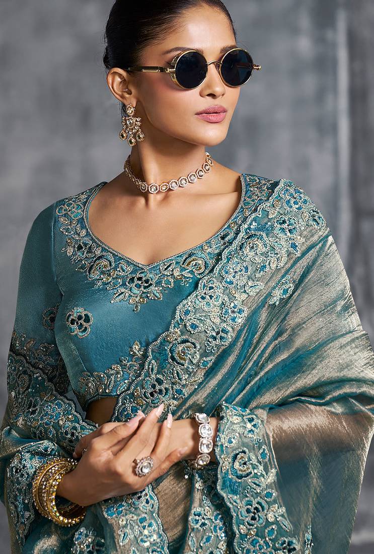 Saree Fabric: Premium Tissue Zari, Saree Color: Aqua Blue, Blouse Fabric: Silk, Blouse Color: Aqua Blue, Work: Resham Thread Embroidery, Intricate Floral Vines, And Crafted Motifs With Embellishments Such As Sequins, Pearls, Mirror Work And Hand Finished Stone Work With Embroidery Blouse, Remark: Saree With Blouse