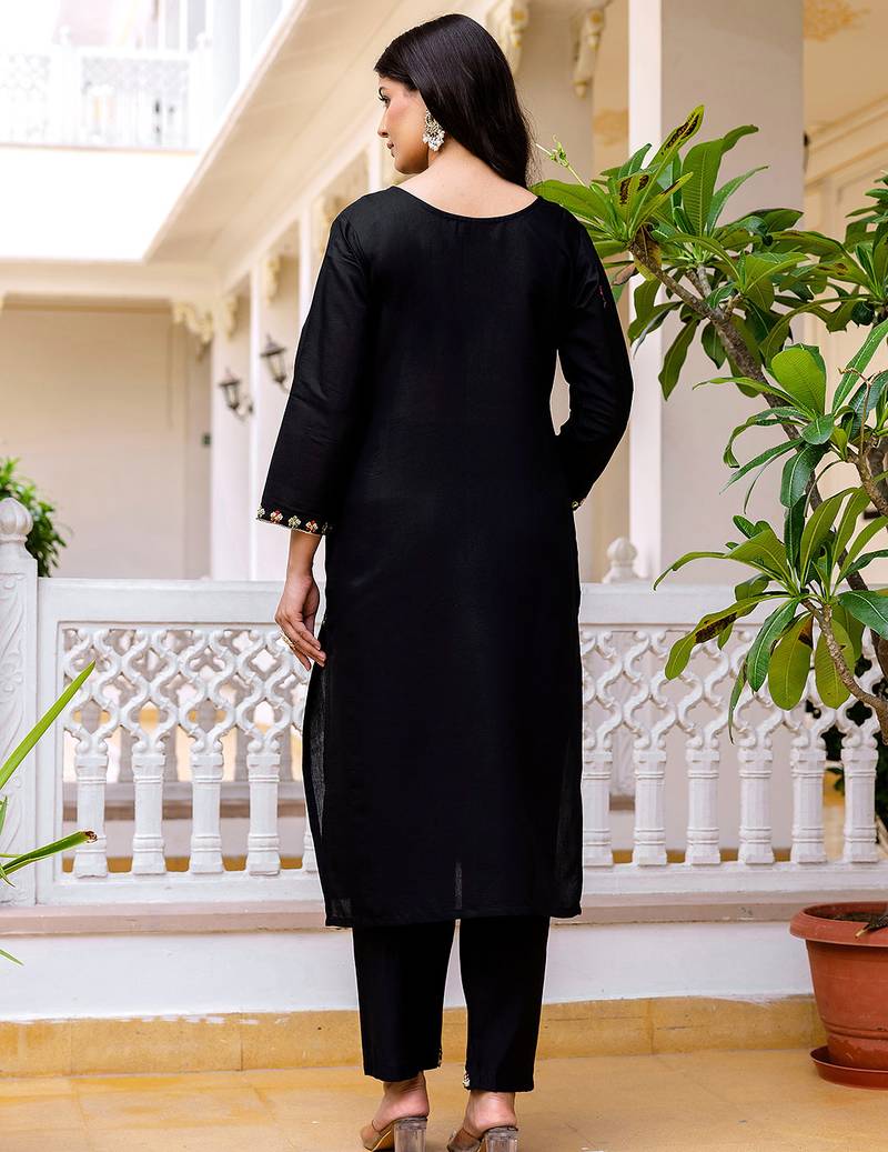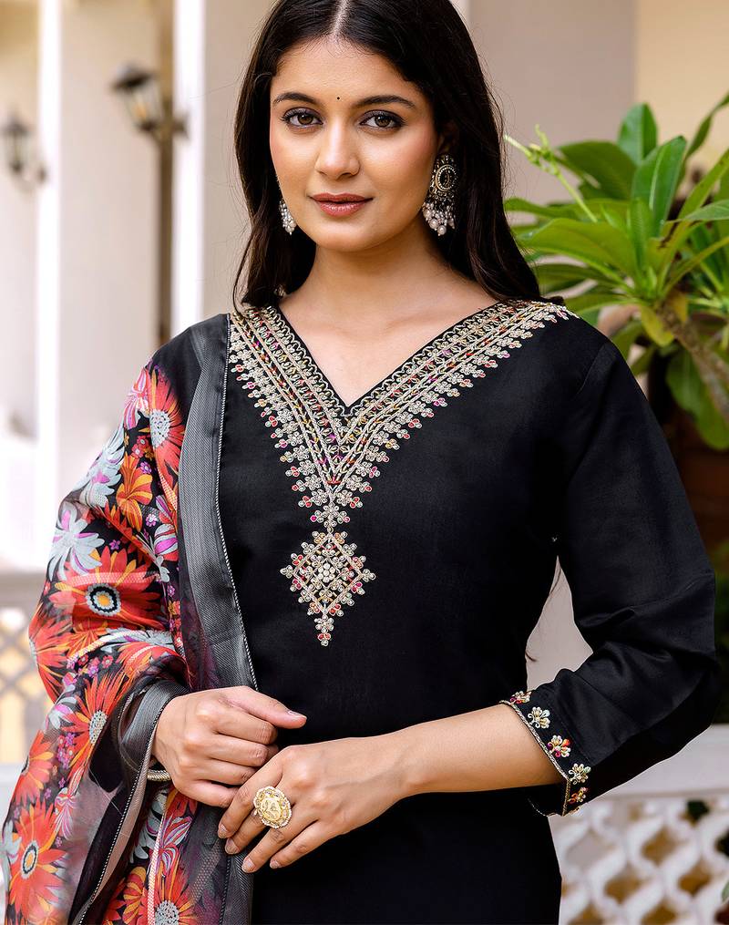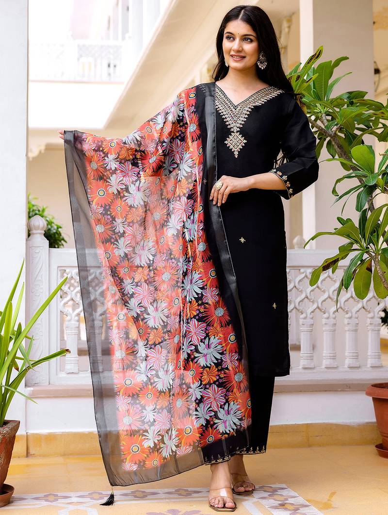 | Product Name | Black Viscose Chanderi Thread Embroidered With Beads Work With Printed Dupatta Kurta Pant Set | |