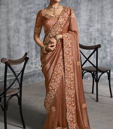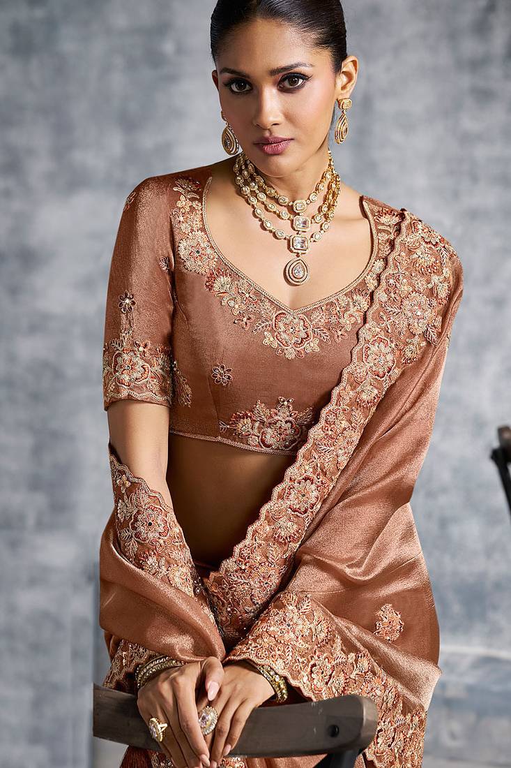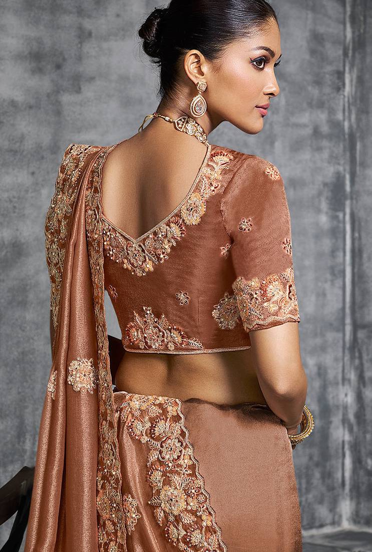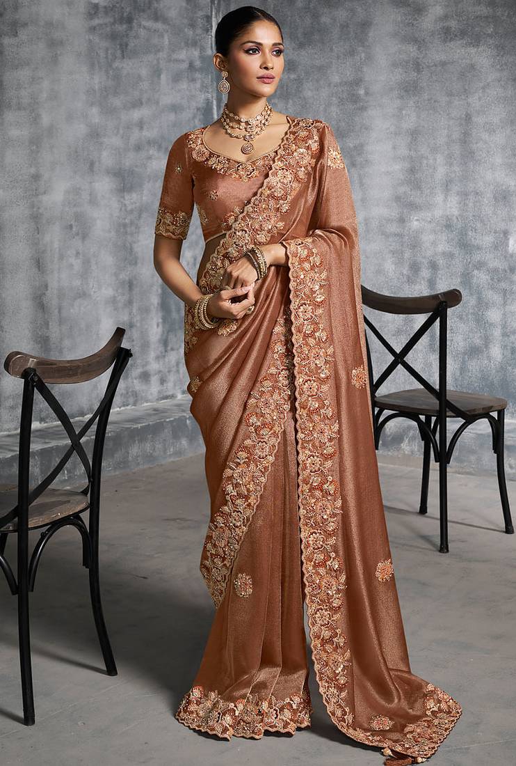Product Name Brown Premium Tissue Zari Resham Thread Embroidery With Pearls, Mirror Work Stone Work Saree With Blouse