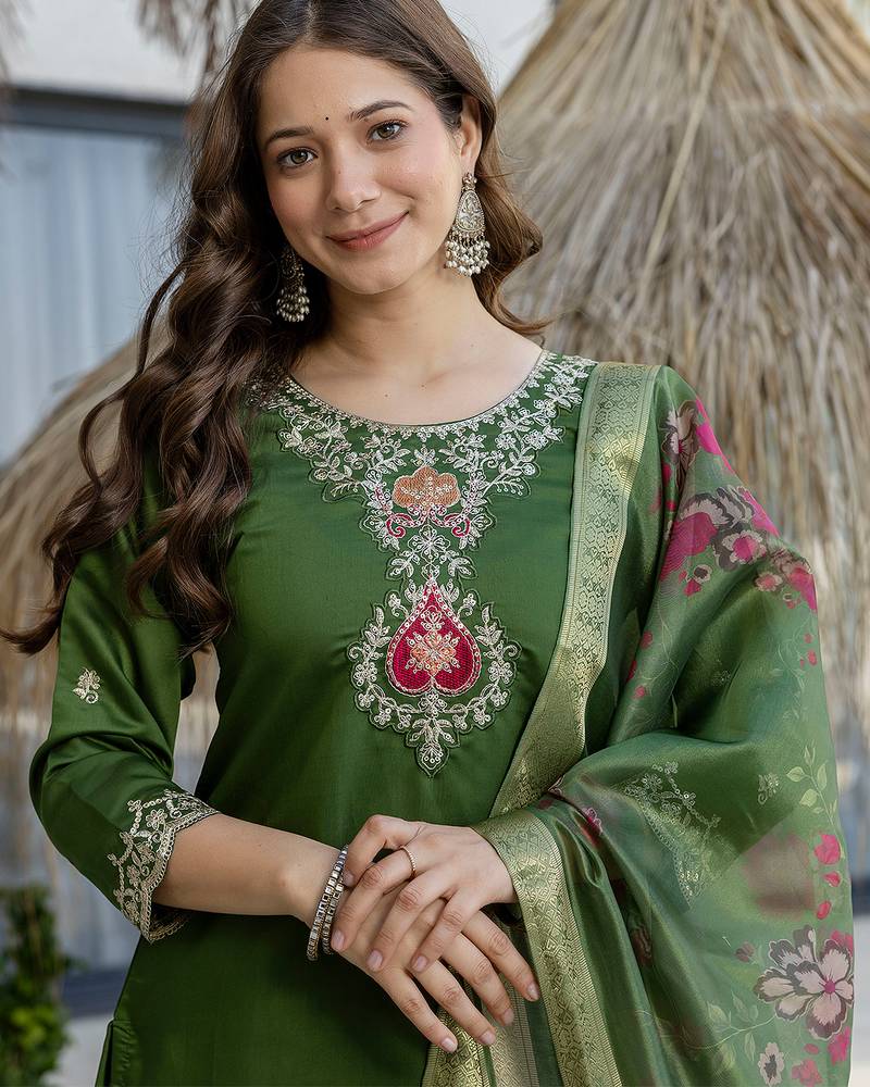 | Product Name | Green Chanderi Heavy Thread Embroidery Work Kurta Pant Set | |