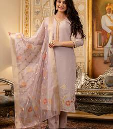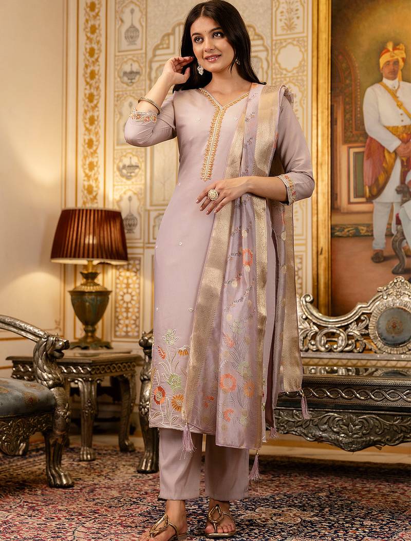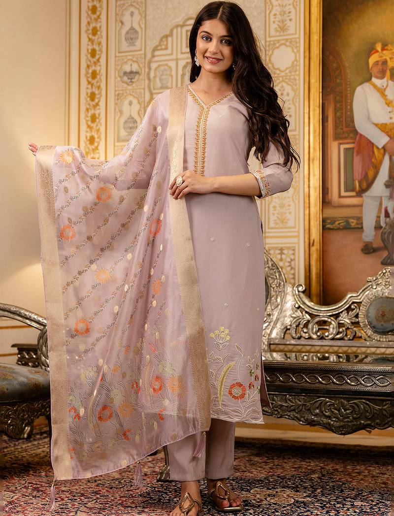 Lavender viscose simer thread embroidered with beads work with printed dupatta kurta pant set