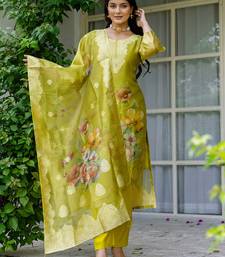 Lemon shimmer organza jacquard woven with print kurta pant set