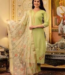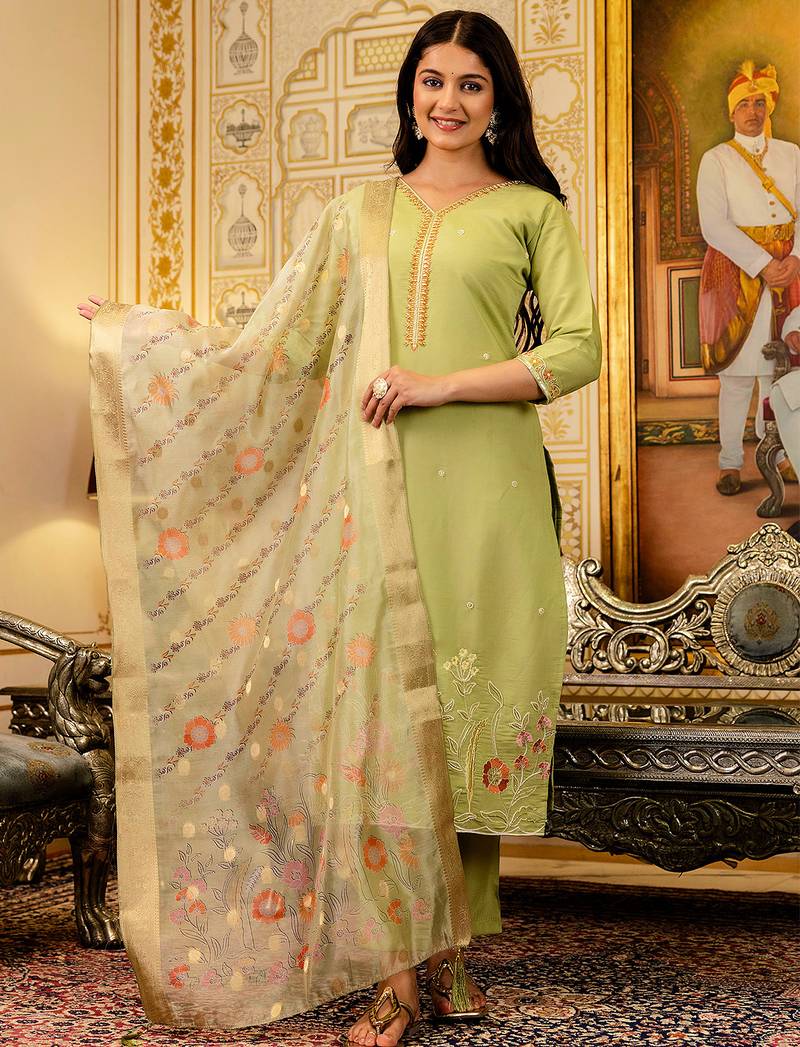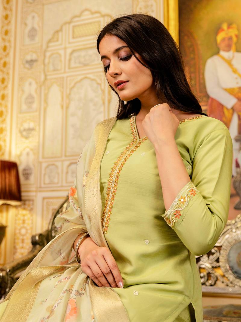 Lemon viscose simer thread embroidered with beads work with printed dupatta kurta pant set