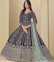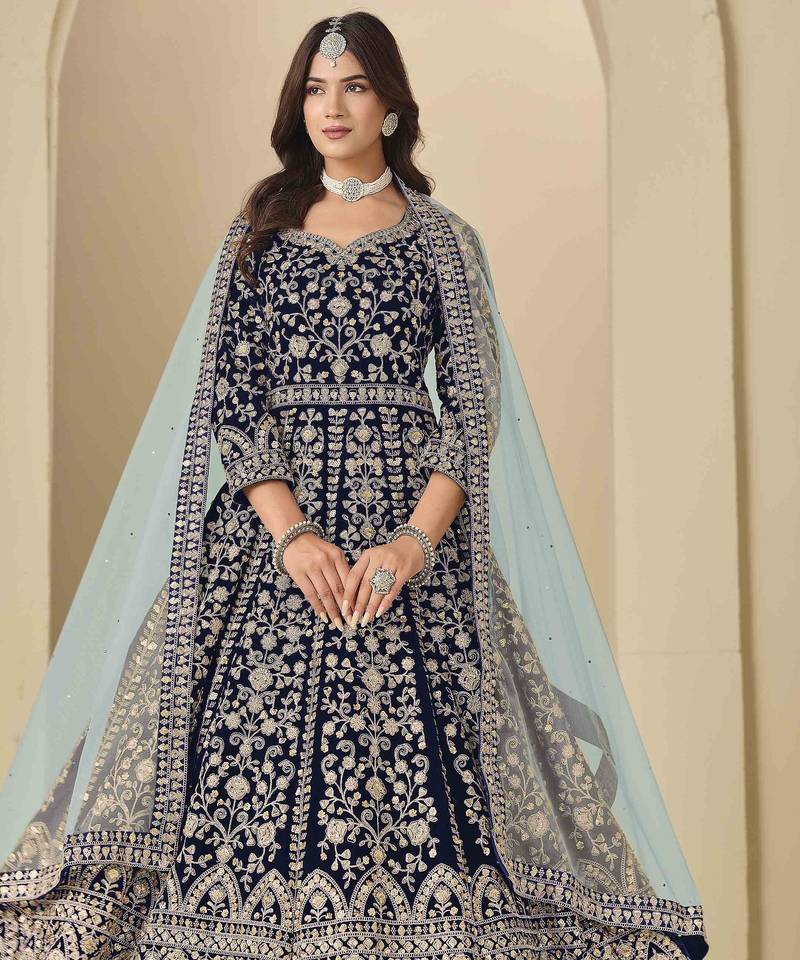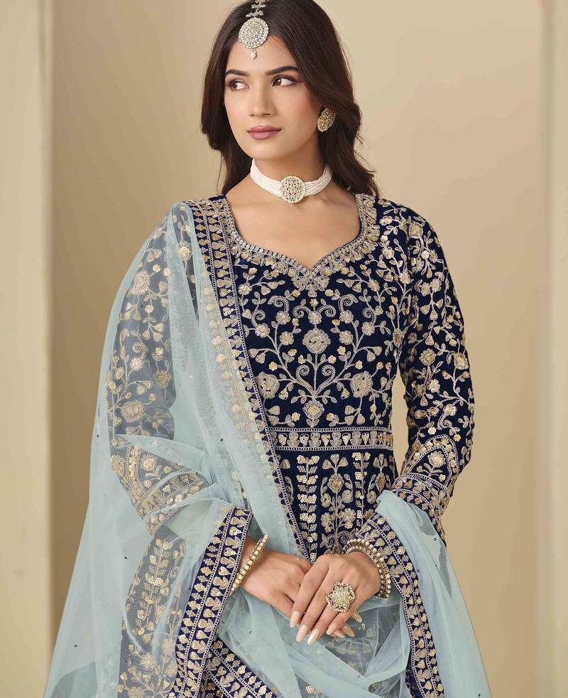 Navy blue velvet heavy thread embroidery with sequins work salwar kameez semi stitched