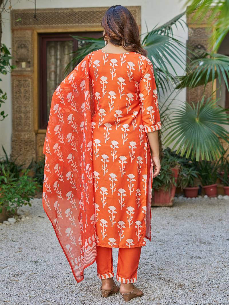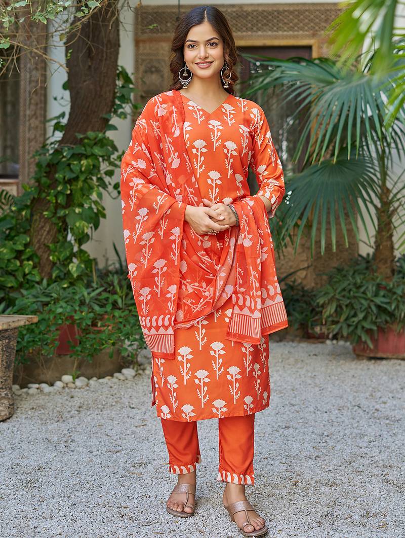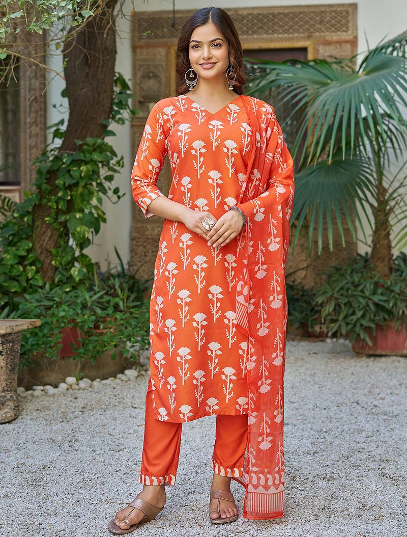 | Product Description | Top Fabric: Cotton Blend, Top Color: Orange, Bottom Fabric: Cotton Blend, Bottom Color: Orange, Dupatta Fabric: Faux Georgette, Dupatta Color: Orange, Work: Printed, Remark: Kurta Pant Set (Size S,M,L,Xl,Xxl), Note: There Might Be Slight Color Variation Due To Lightings & Flash While Photo Shoot. |