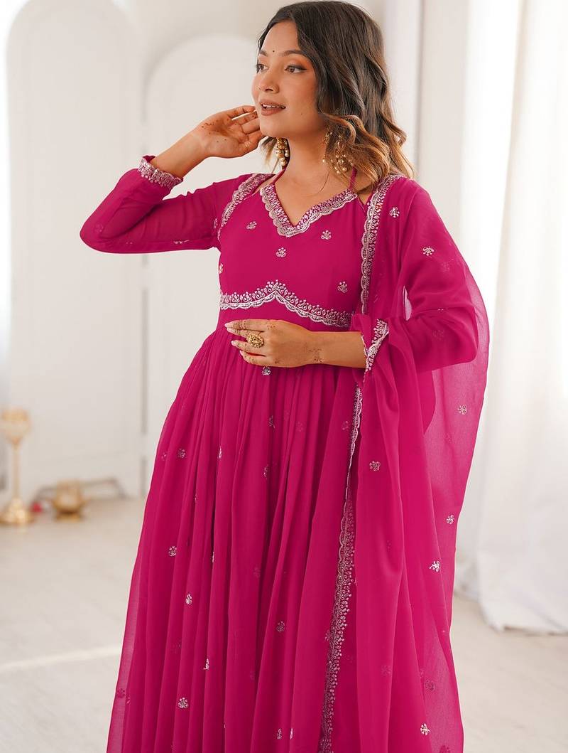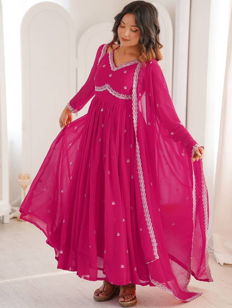 | Product Description | Top Fabric: Georgette, Top Color: Pink, Bottom Fabric: Viscose, Bottom Color: Pink, Dupatta Fabric: Georgette, Dupatta Color: Pink, Work: Heavy Thread Embroidery Work, Remark: Kurta Pant Set (Size S,M,L,Xl,Xxl), Note: There Might Be Slight Color Variation Due To Lightings & Flash While Photo Shoot. |