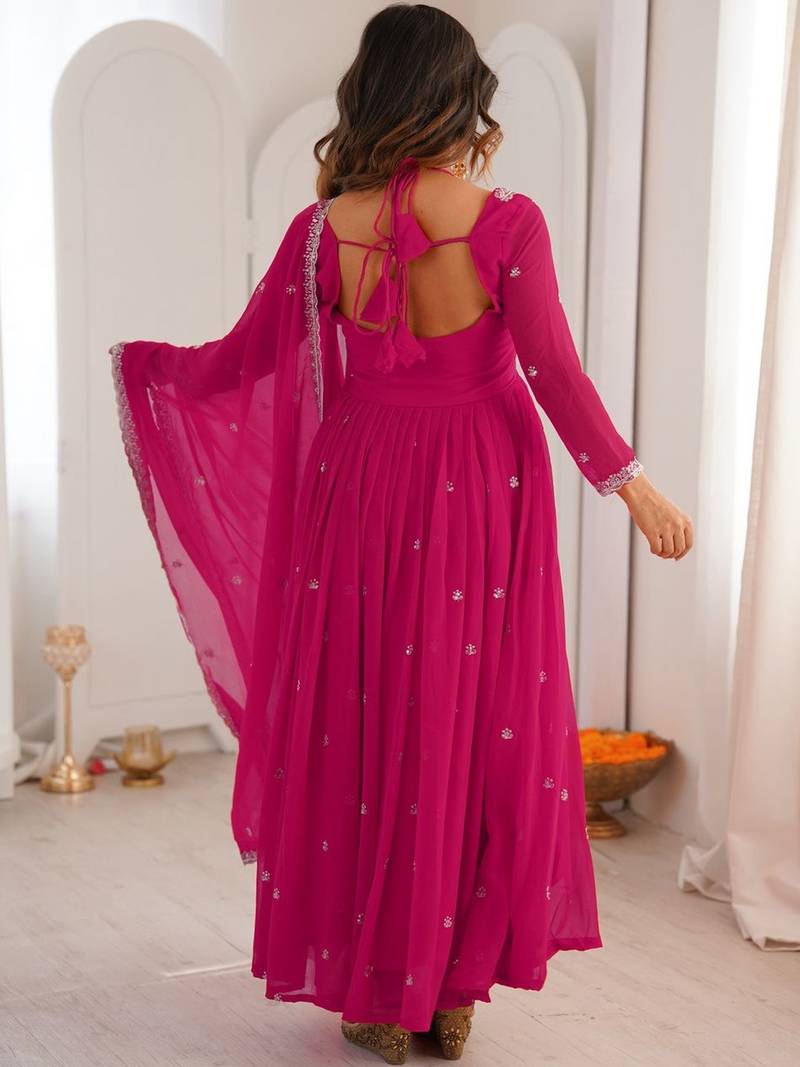 Pink georgette heavy thread embroidery work kurta pant set
