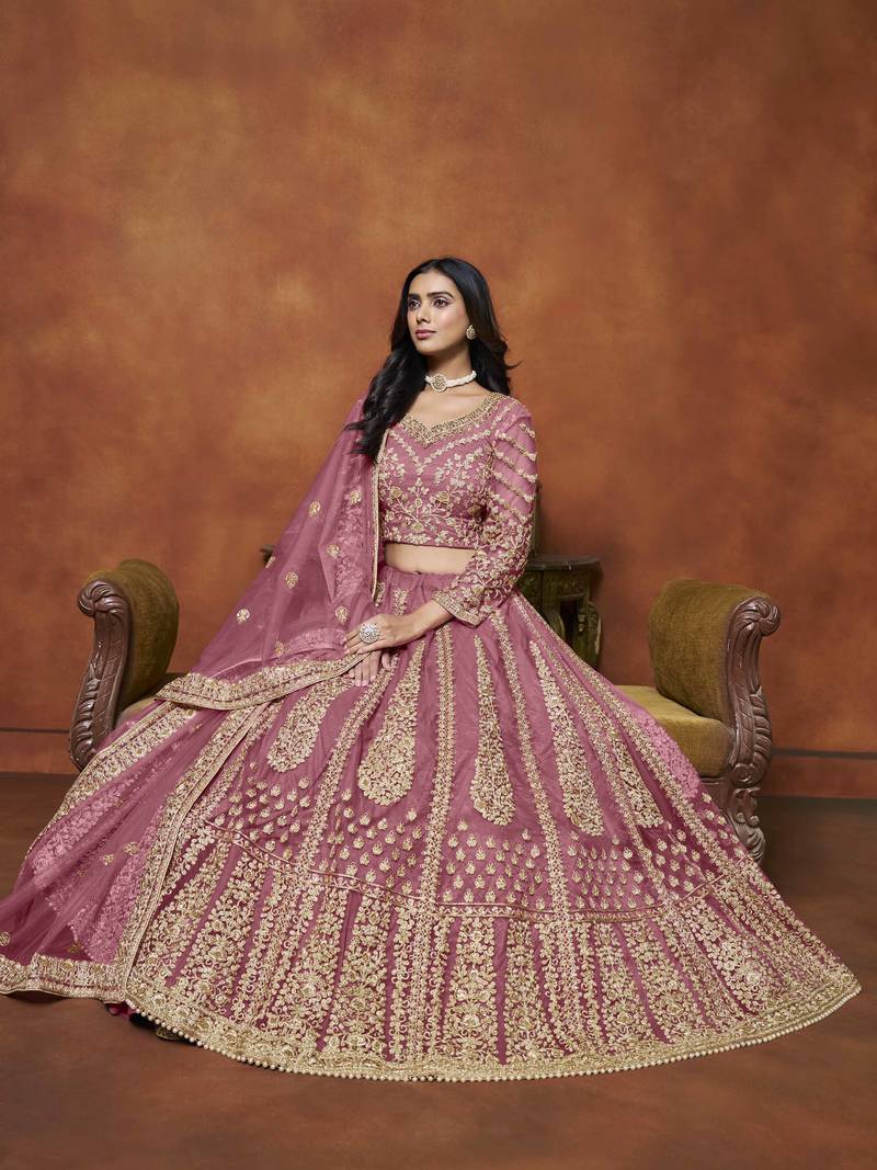 Pink net heavy thread embroidery with sequins work lehenga choli set with dupatta