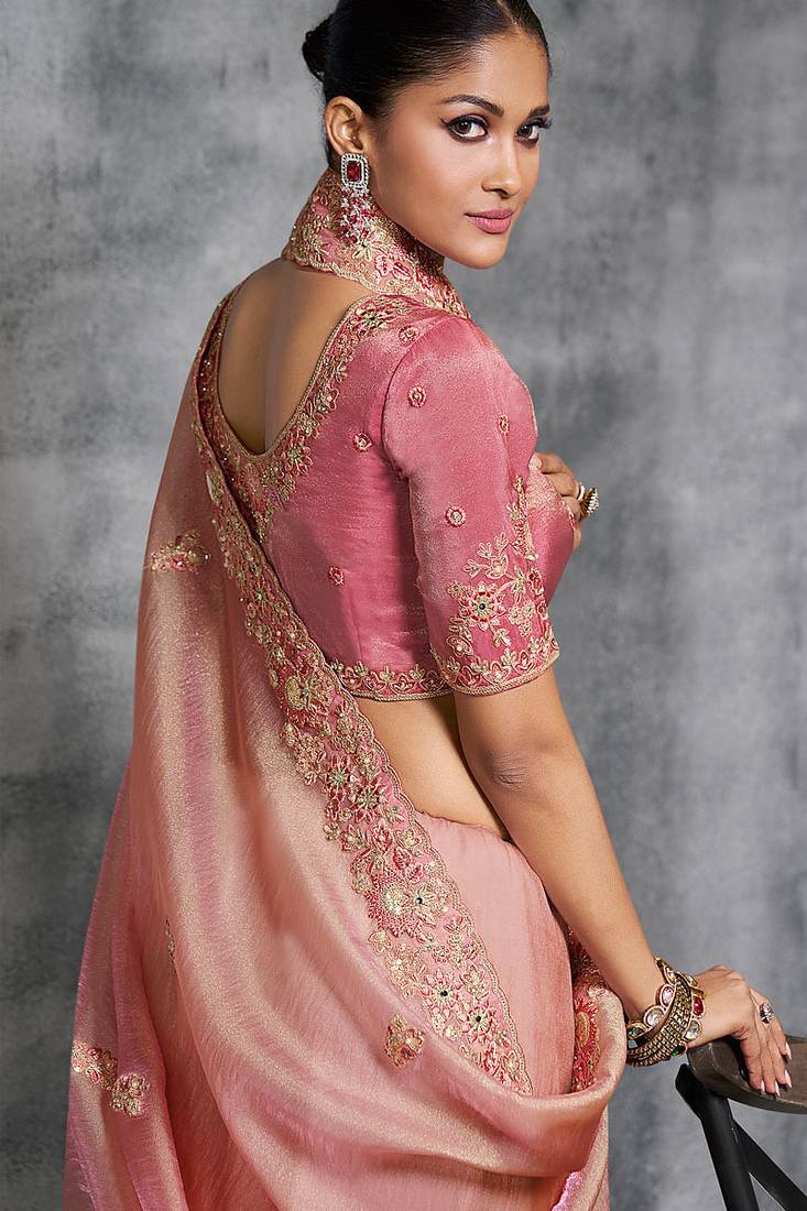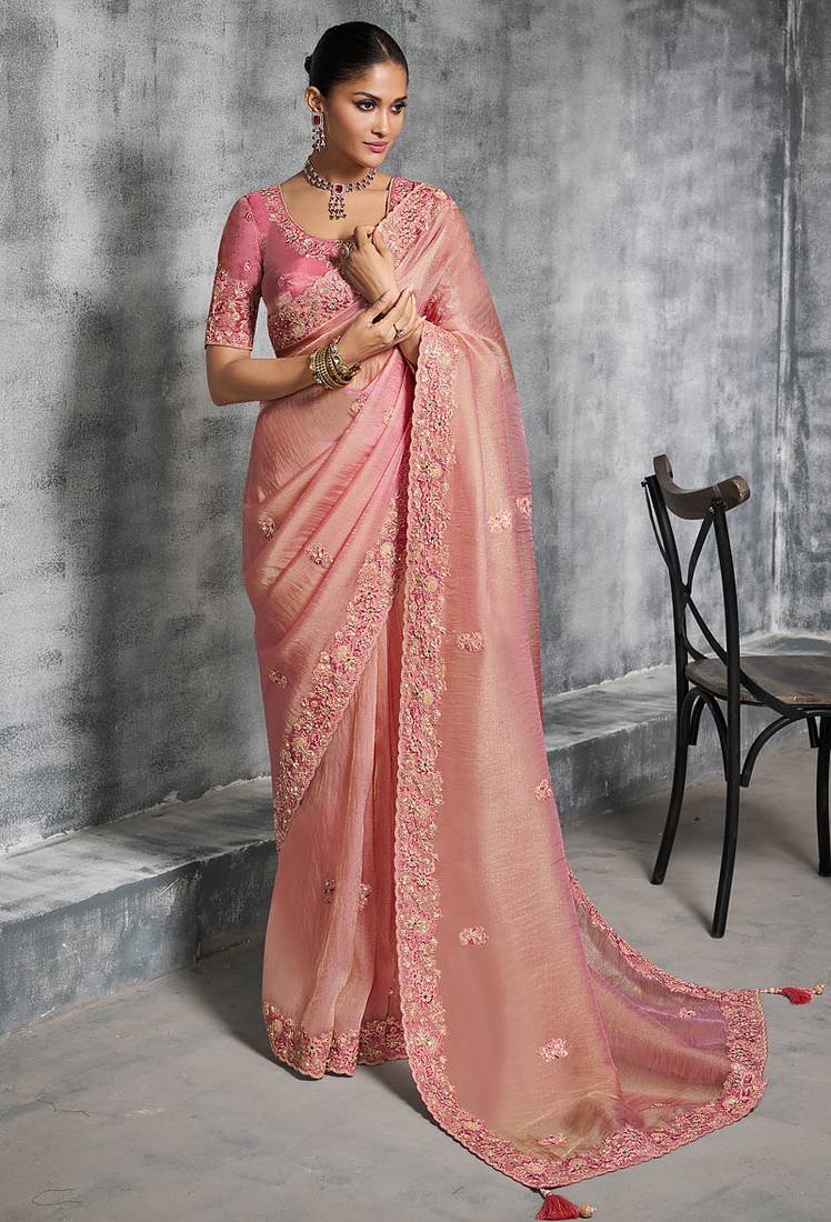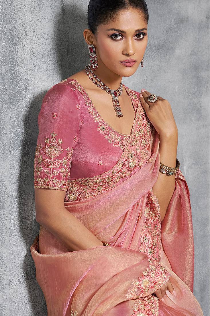 Pink premium tissue zari resham thread embroidery with pearls, mirror work stone work saree with blouse