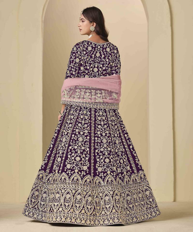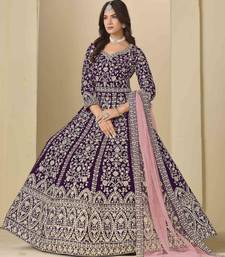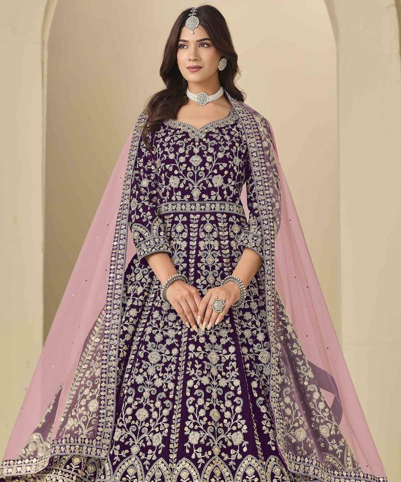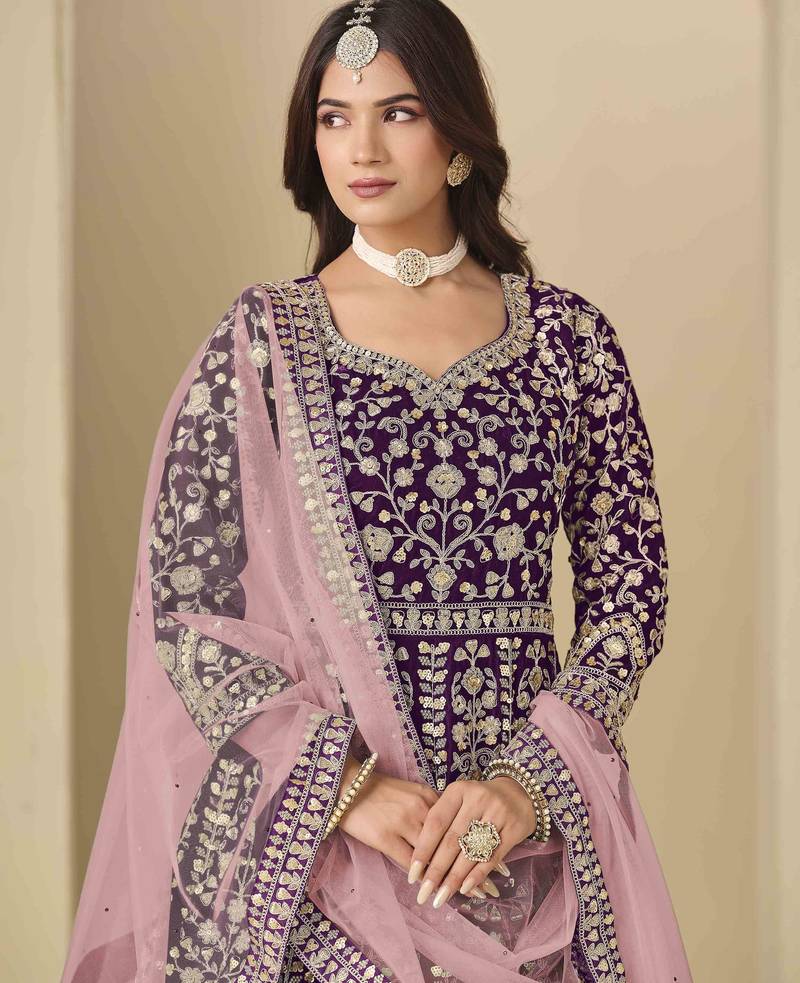 Purple velvet heavy thread embroidery with sequins work salwar kameez semi stitched