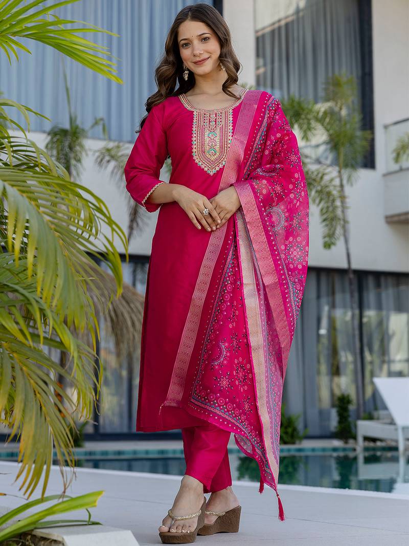 Rani pink chanderi cotton heavy thread embroidery work with printed dupatta kurta pant set